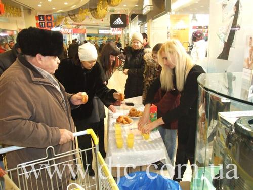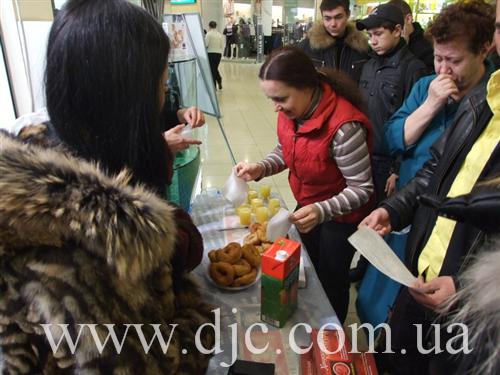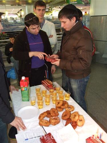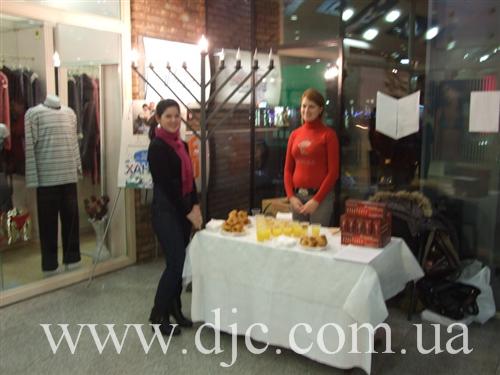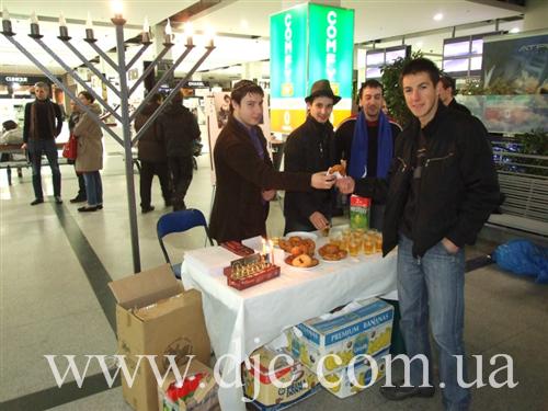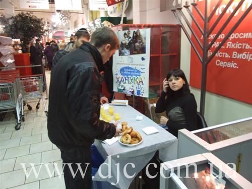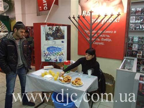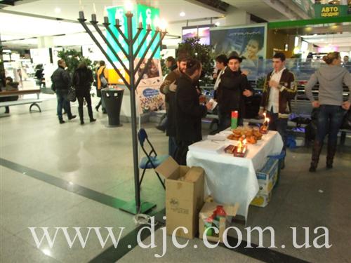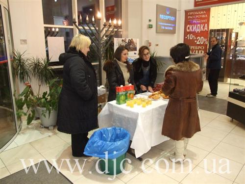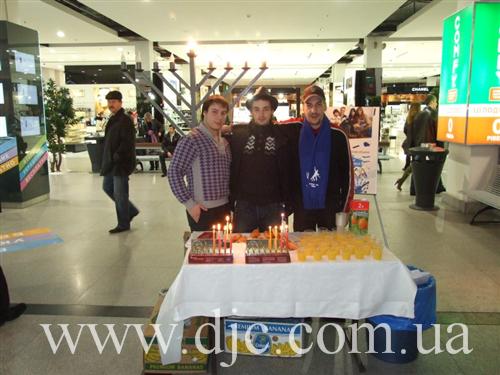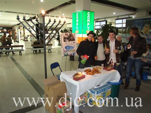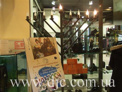 Каждый день в крупнейших торговых центрах Днепропетровска зажигают свечи на установленных в людных местах ханукальных светильниках, а волонтеры общины рассказывают о истории и чудесах праздника, предлагают попробовать традиционное ханукальное угощение и раздают ханукальные наборы – восьмисвечник со свечами, для выполнения главной заповеди праздника – зажигать ханукальные огни.