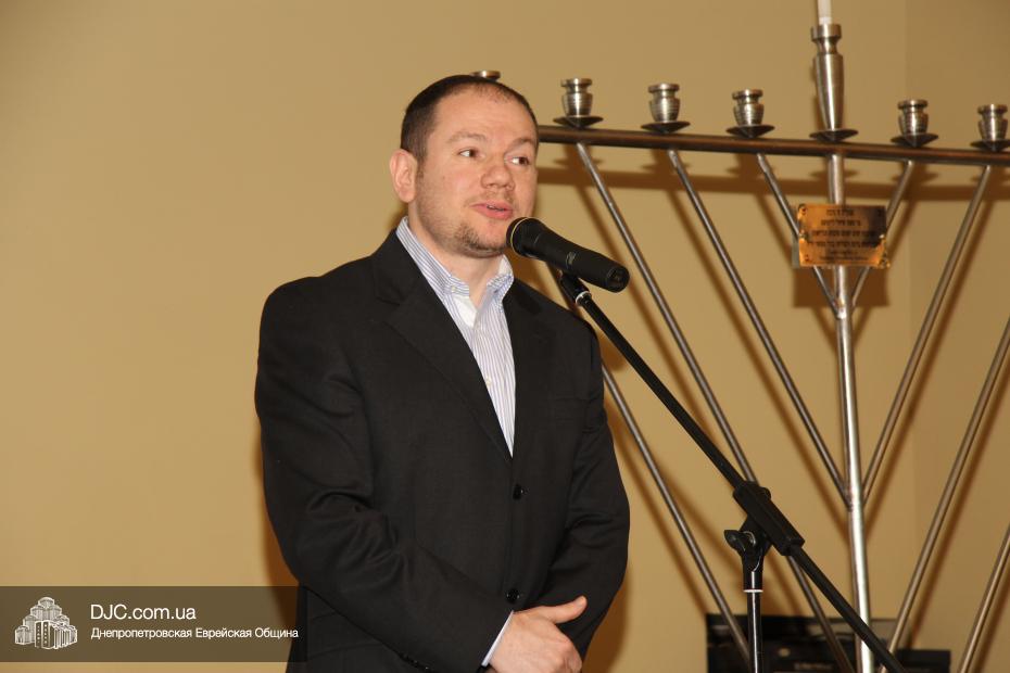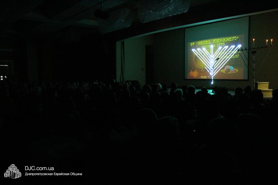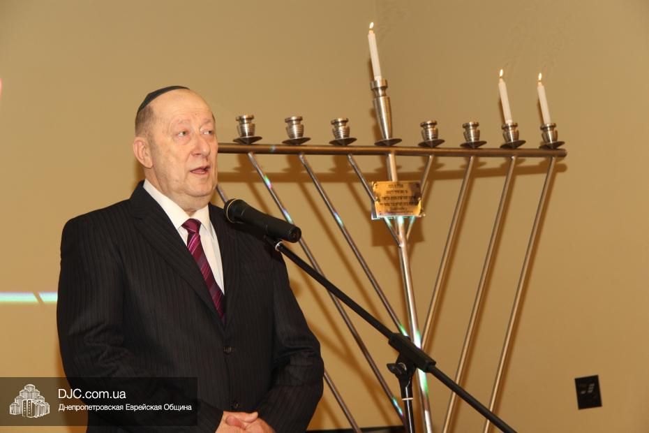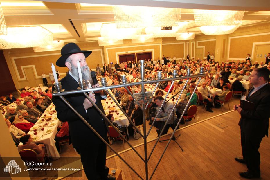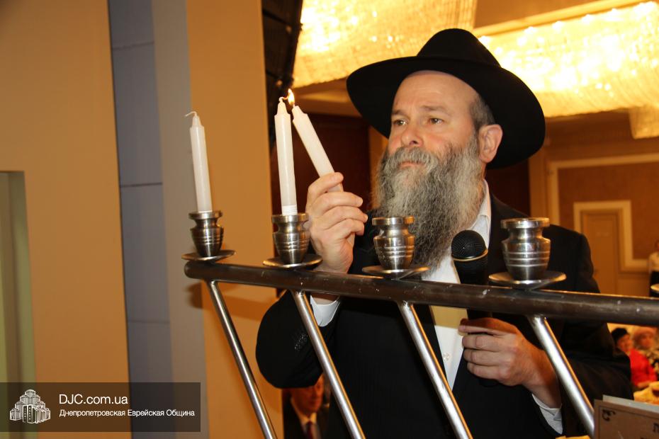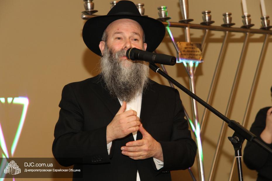 Затем с поздравительной речью выступил Главный раввин Днепропетровска и региона Шмуэль Каминецкий, пожелавший чтобы все в зале через год снова встретились на Хануку в добром здравии и, прочитав благословения, провел обряд зажжения Ханукии, а Йонатан Лейфер прочитал перевод благословений.