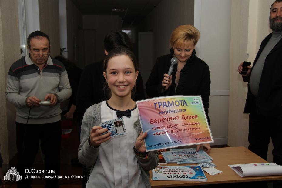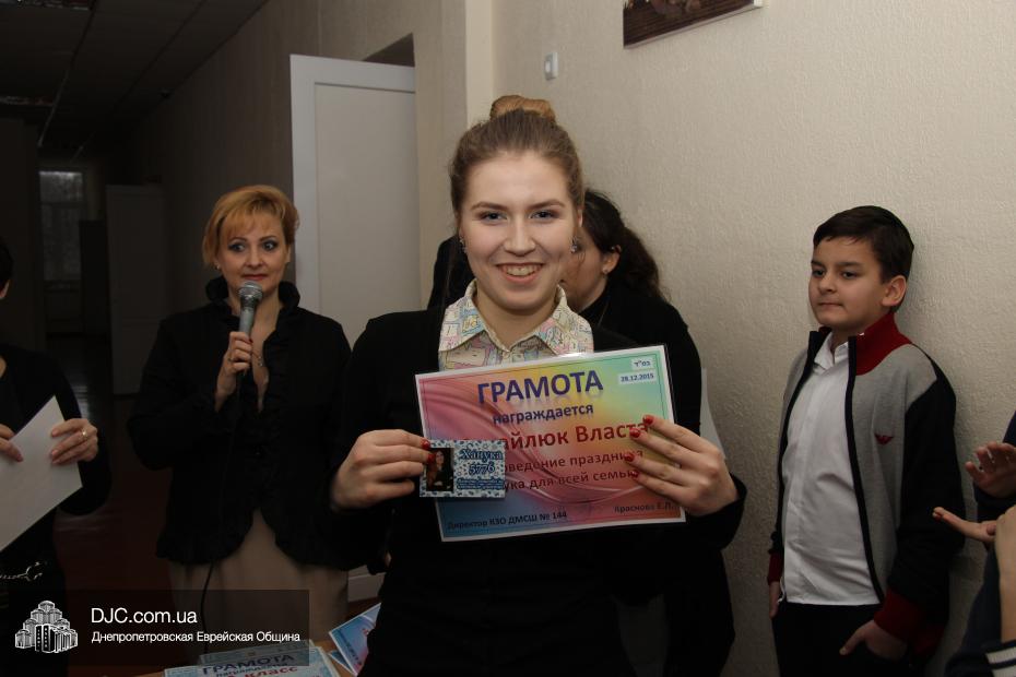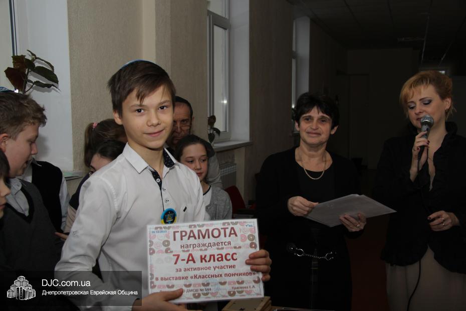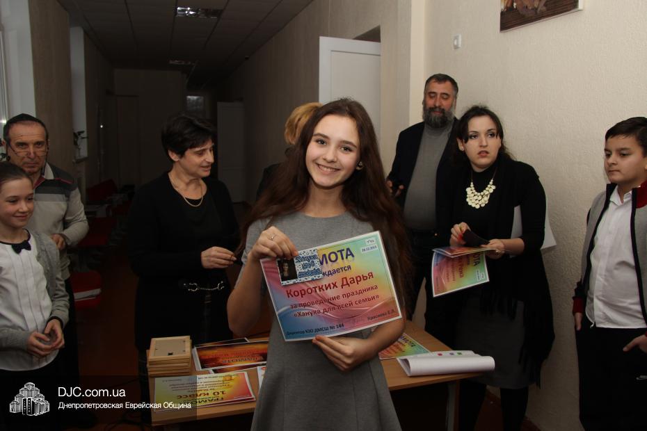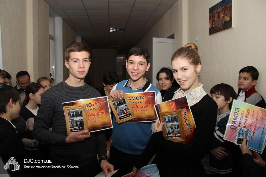 Кроме того, администрация школы, подведя итоги всех мероприятий, определила самые лучшие классы по всем ханукальным мероприятиям. Их оказалось два, и высшие награды школы за Хануку 5776 были вручены Эрику Дановичу, как представителю 7-А класса, и Кэрен Макогон, как представителю 8-А класса.