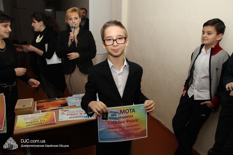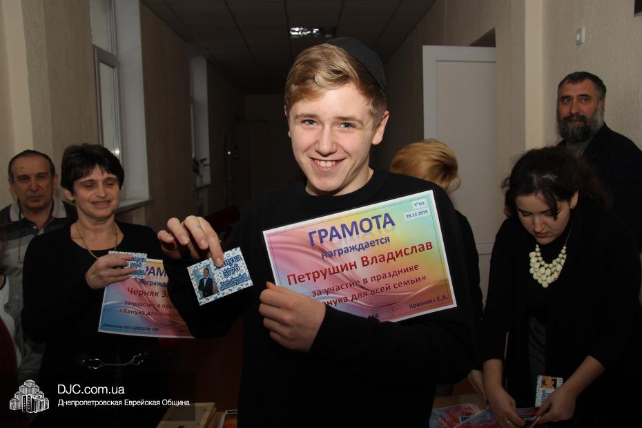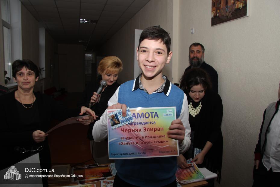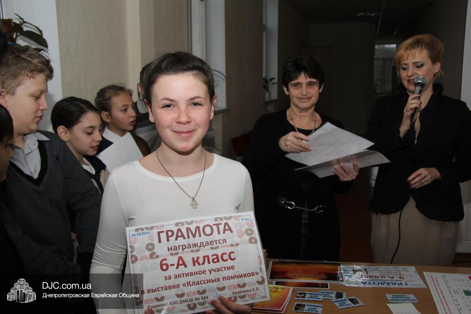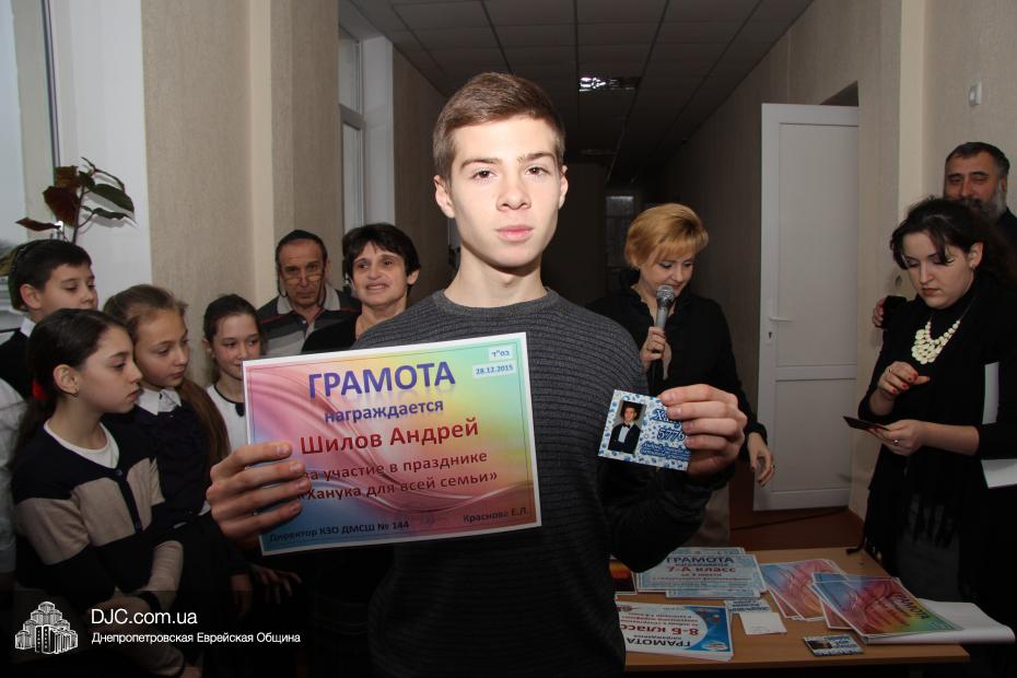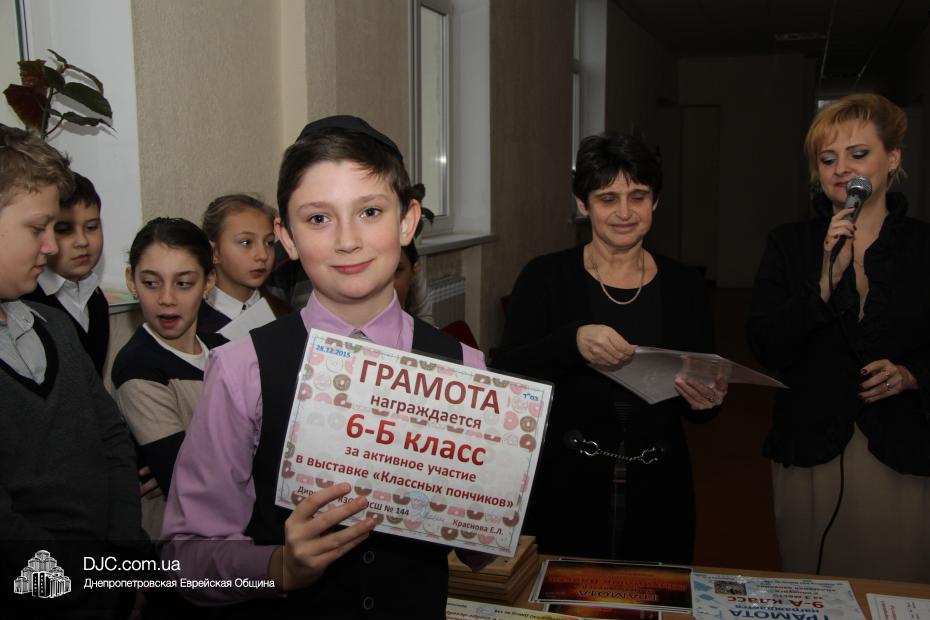 Кроме того, администрация школы, подведя итоги всех мероприятий, определила самые лучшие классы по всем ханукальным мероприятиям. Их оказалось два, и высшие награды школы за Хануку 5776 были вручены Эрику Дановичу, как представителю 7-А класса, и Кэрен Макогон, как представителю 8-А класса.