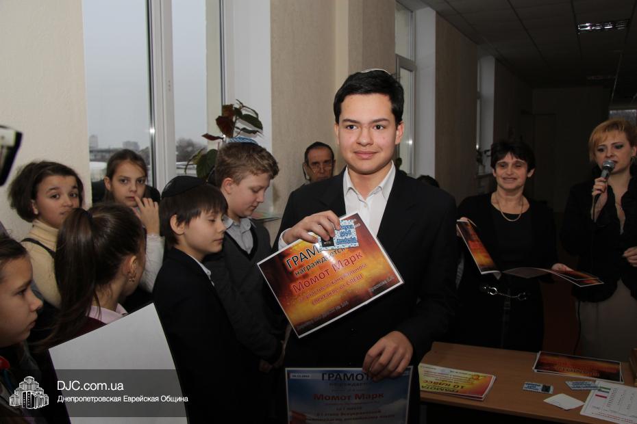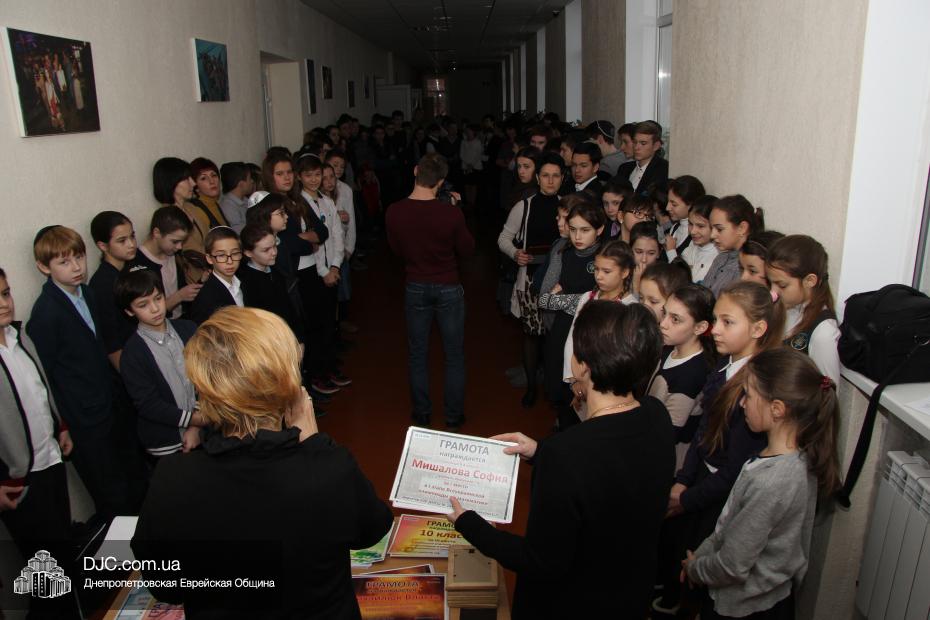 Итоги «Ханукального марафона» подводили, как всегда, сначала в старшей школе, а потом – в младшей. В некоторых случаях вручалась награда персональная, а в других – коллективная, всему классу, и принимать ее выходил представитель класса, так что на фотографиях некоторые из учеников представлены несколько раз, но мы считаем, что это правильно, и мы рады показать вам как можно больше фотографий, чтобы наши читатели также гордились замечательными воспитанниками еврейской школы.