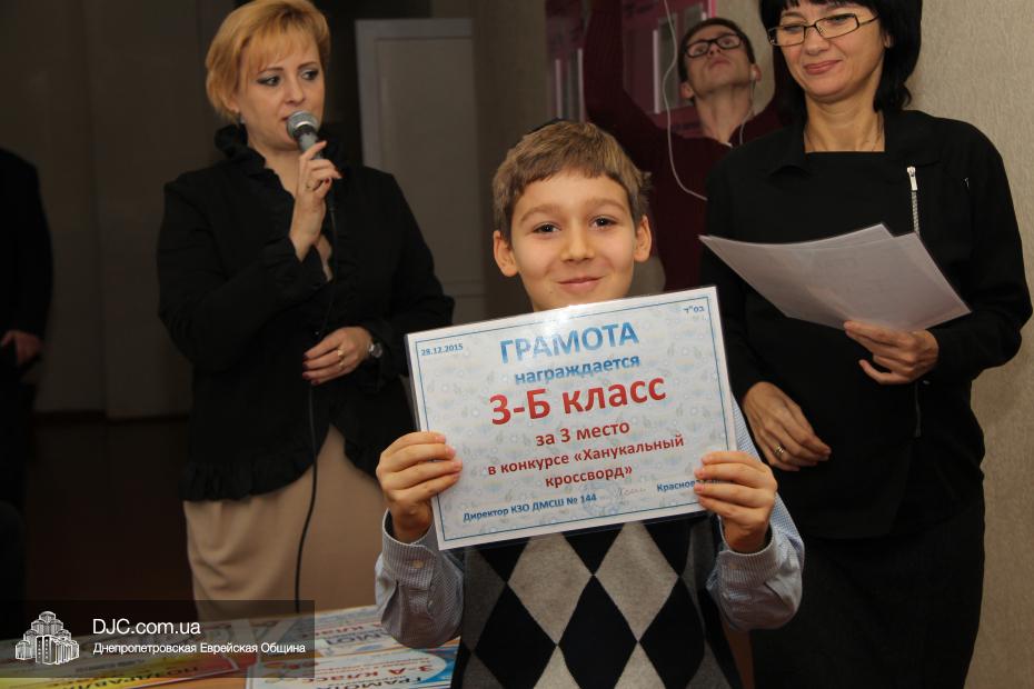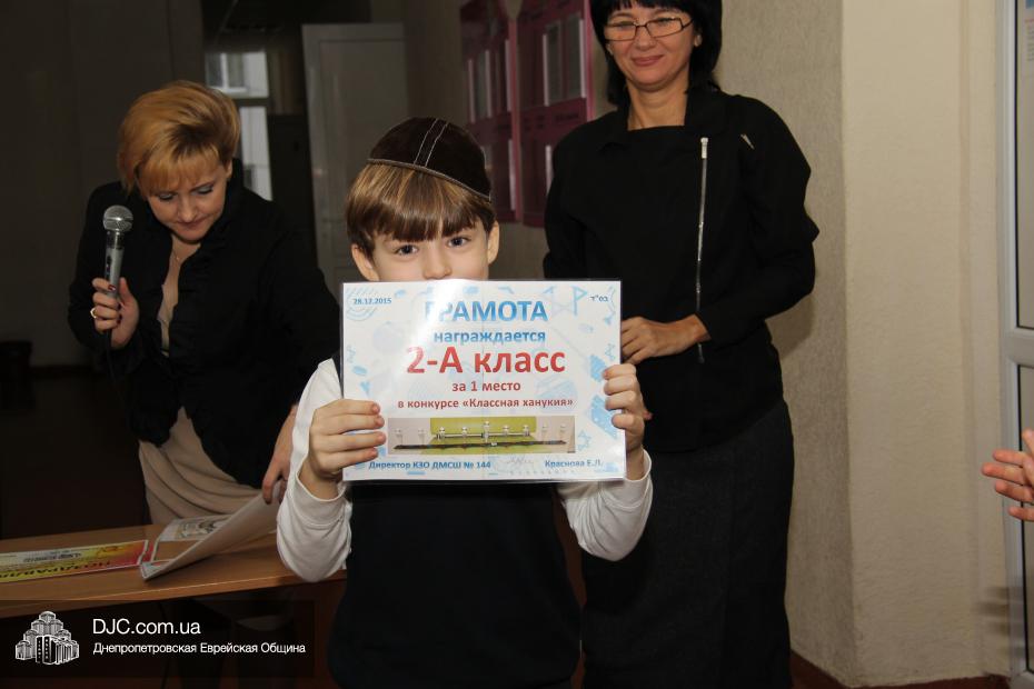 Лев Дольник был приглашен принять награду для всего 2-А класса за первое место в общешкольном конкурсе «Классная ханукия» (напомним, что в конкурсе не было разделения на возрастные группы, и II и III места заняли куда более старшие классы – 6-А и 9-А).