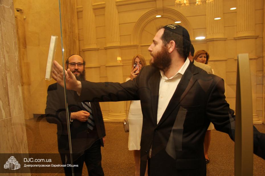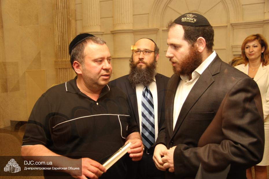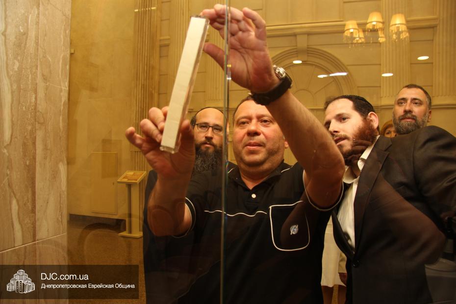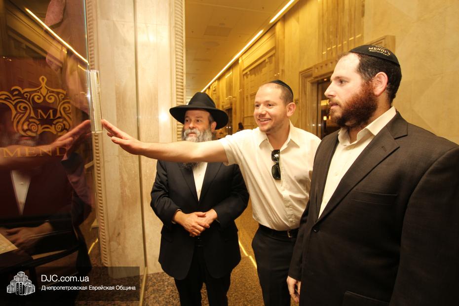 Прочитал благословение и торжественно прикрепил мезузу к главному входу на территорию ресторана Главный раввин Днепропетровска и региона Шмуэль Каминецкий, а ко входу в VIP-зал ресторана – член Попечительского Совета Днепропетровской еврейской общины Давид Басс.