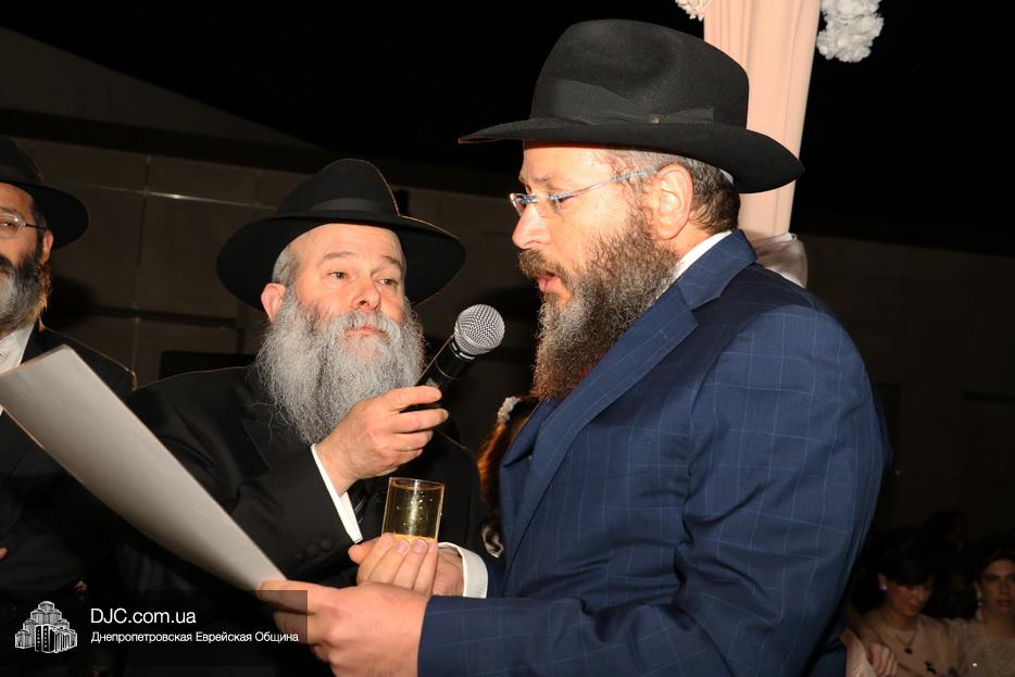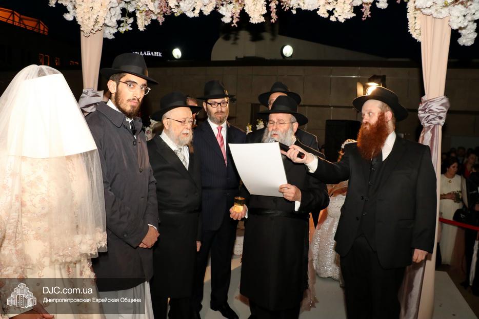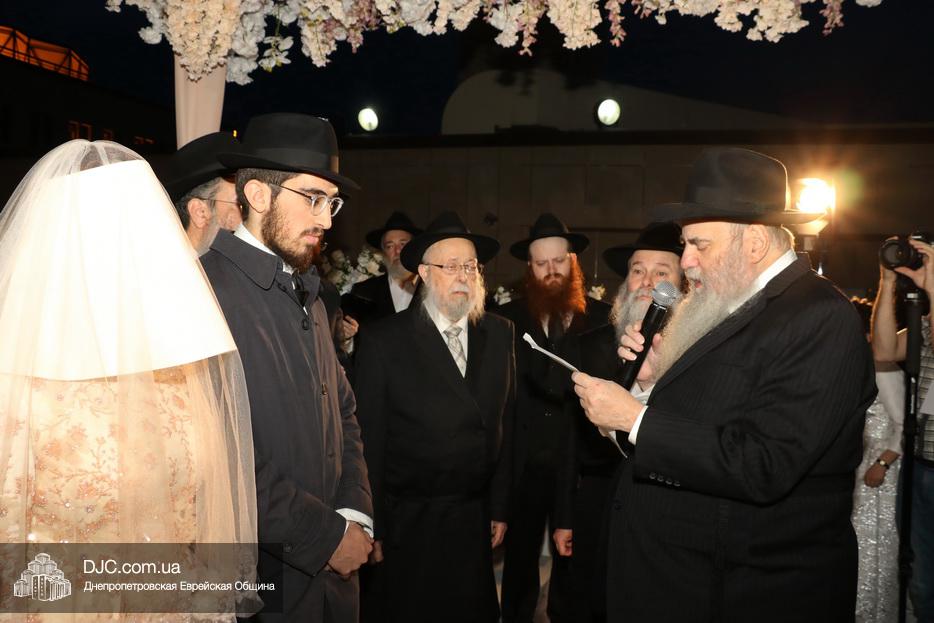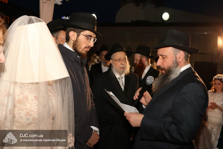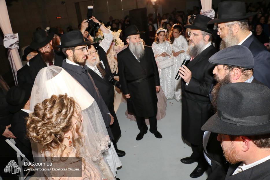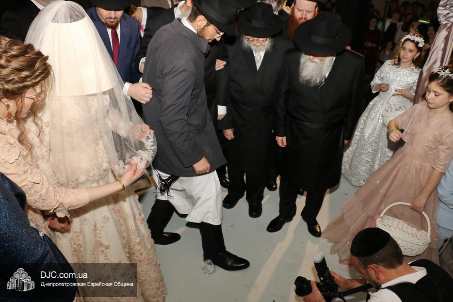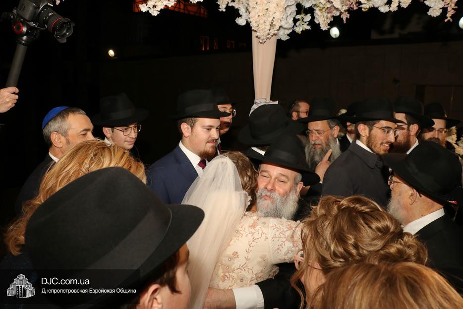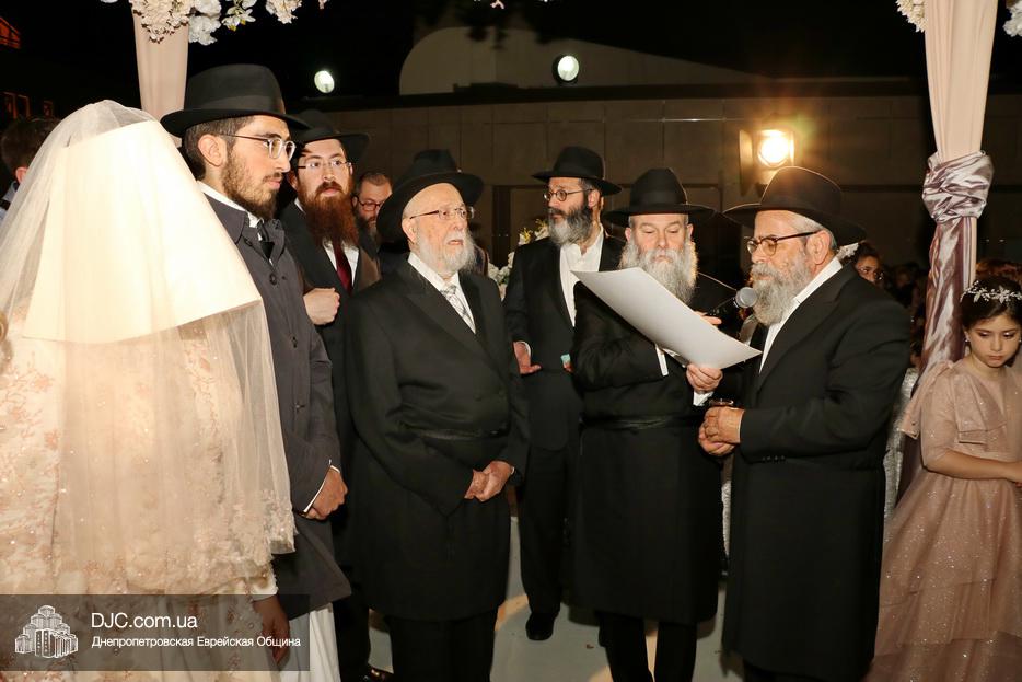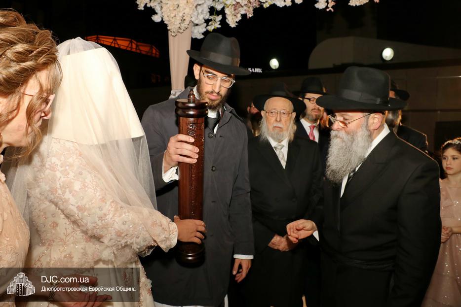 Затем невесту семь раз обвели вокруг жениха, стоящего под Хупой, под звуки традиционного гимна «Арба Бавот», далее свадебный гимн «Ми Адир» исполнил муж сестры невесты раввин Йосеф Ицхак Кляйн; письмо-благословение Любавического Ребе прочел один из самых известных лидеров Всемирного движения «ХаБаД Любавич», глава службы посланников во всем мире, руководитель Всемирного центра еврейского образования «Мерказ Лионей Хинух», раввин Мойше Котлярский; а перевод прочел Председатель Совета «Федерации еврейских общин Украины», Президент МГПИ «Бейт Хана», член Попечительского Совета еврейской общины Днепра, раввин Меир Цви Стамблер.