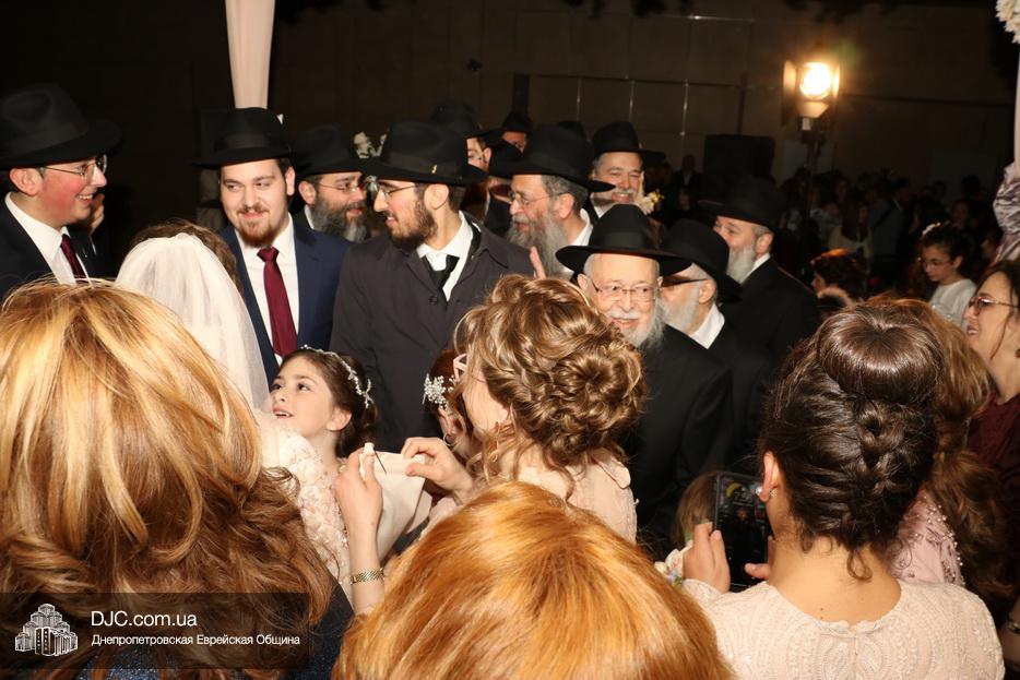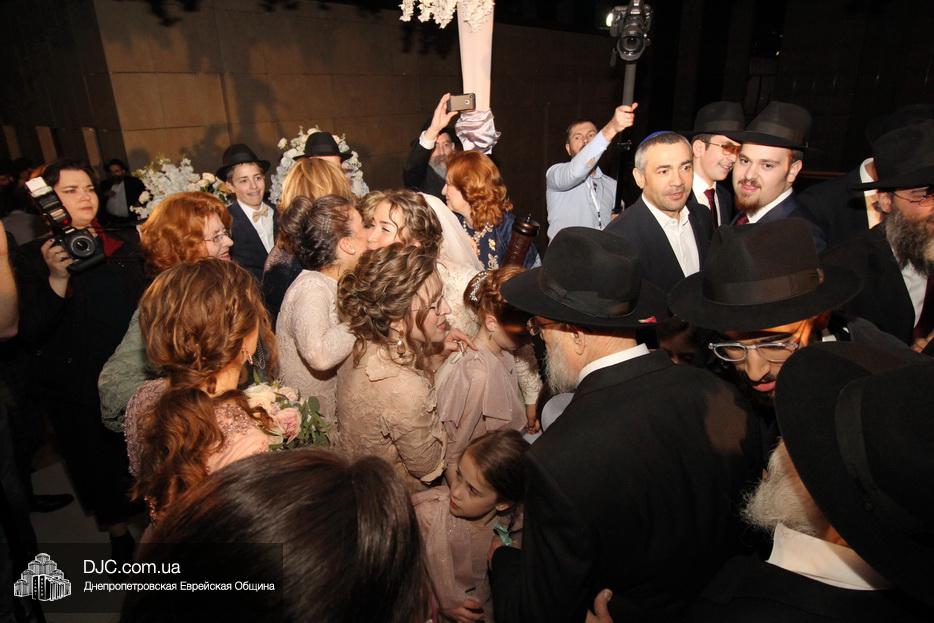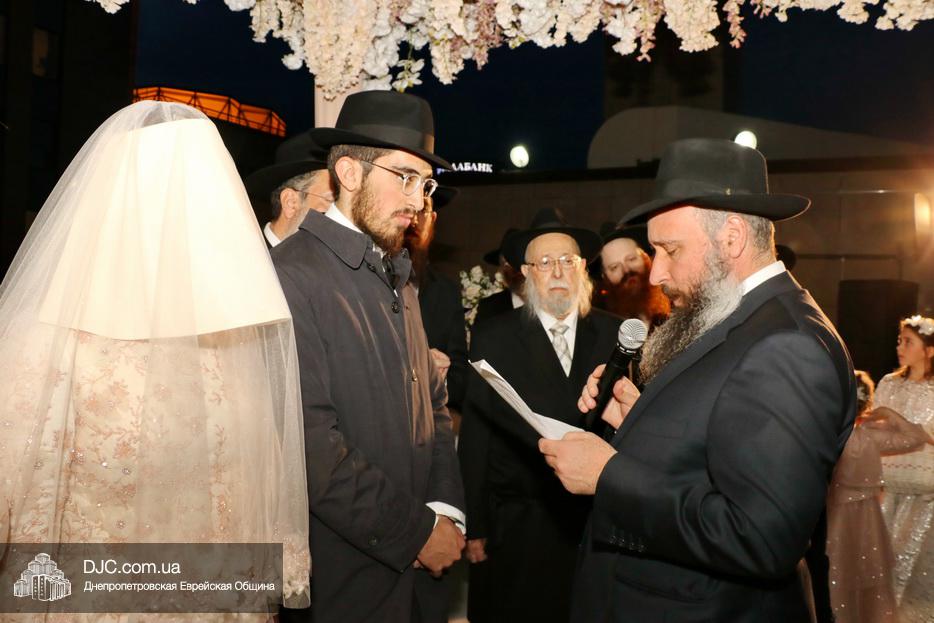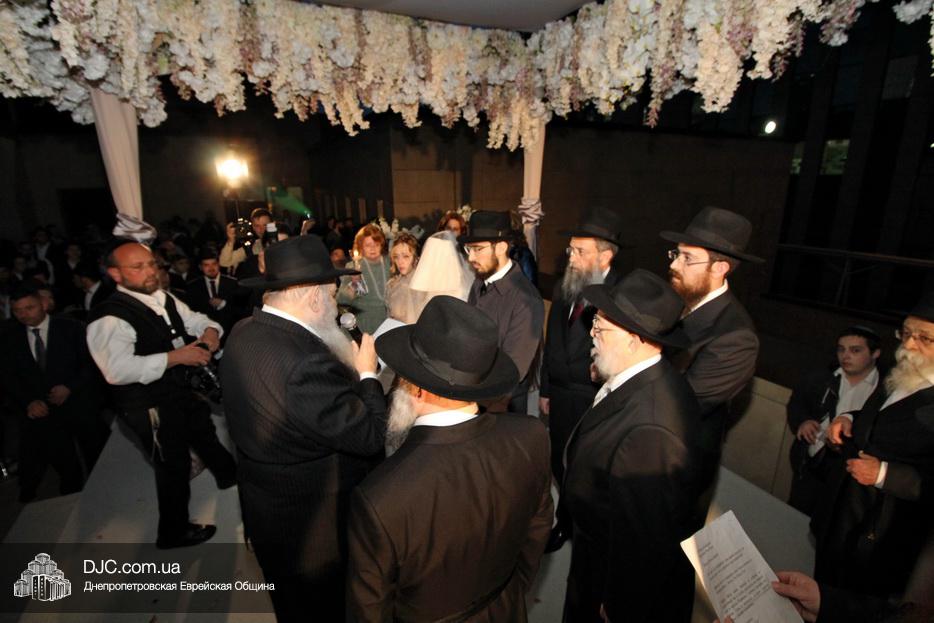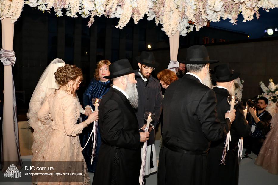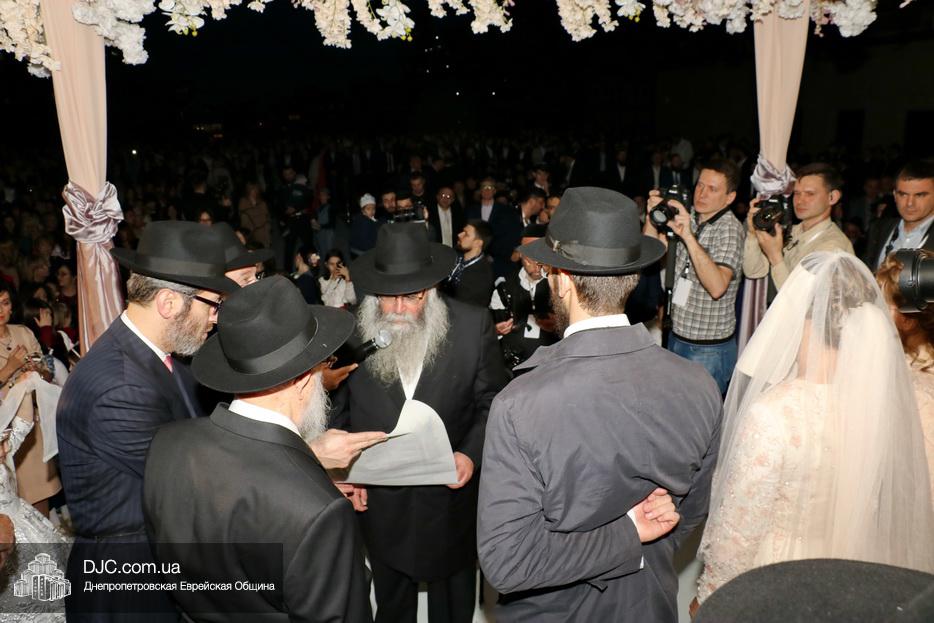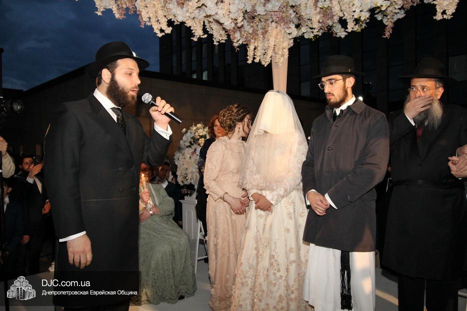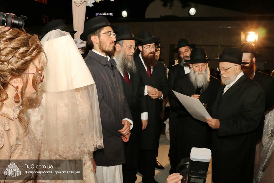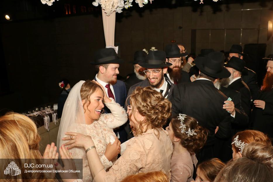 Затем невесту семь раз обвели вокруг жениха, стоящего под Хупой, под звуки традиционного гимна «Арба Бавот», далее свадебный гимн «Ми Адир» исполнил муж сестры невесты раввин Йосеф Ицхак Кляйн; письмо-благословение Любавического Ребе прочел один из самых известных лидеров Всемирного движения «ХаБаД Любавич», глава службы посланников во всем мире, руководитель Всемирного центра еврейского образования «Мерказ Лионей Хинух», раввин Мойше Котлярский; а перевод прочел Председатель Совета «Федерации еврейских общин Украины», Президент МГПИ «Бейт Хана», член Попечительского Совета еврейской общины Днепра, раввин Меир Цви Стамблер.