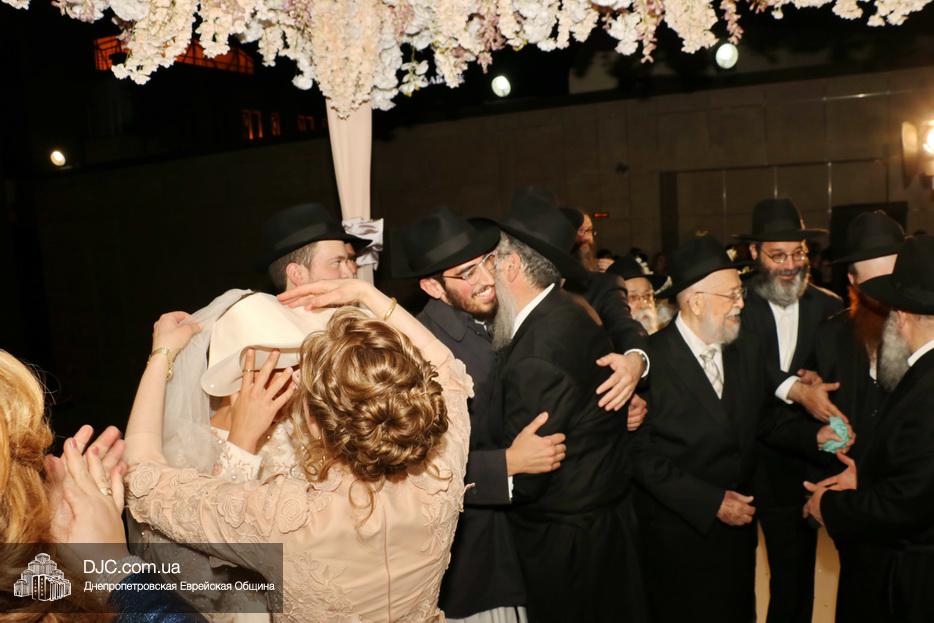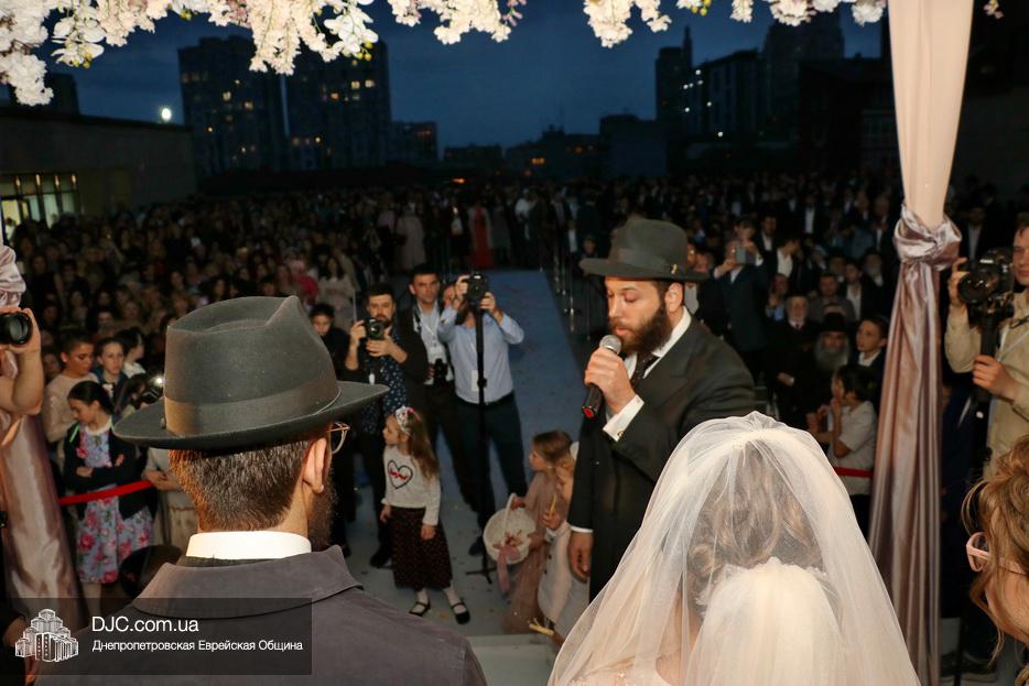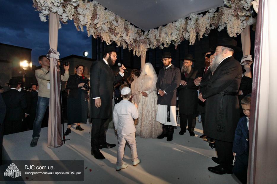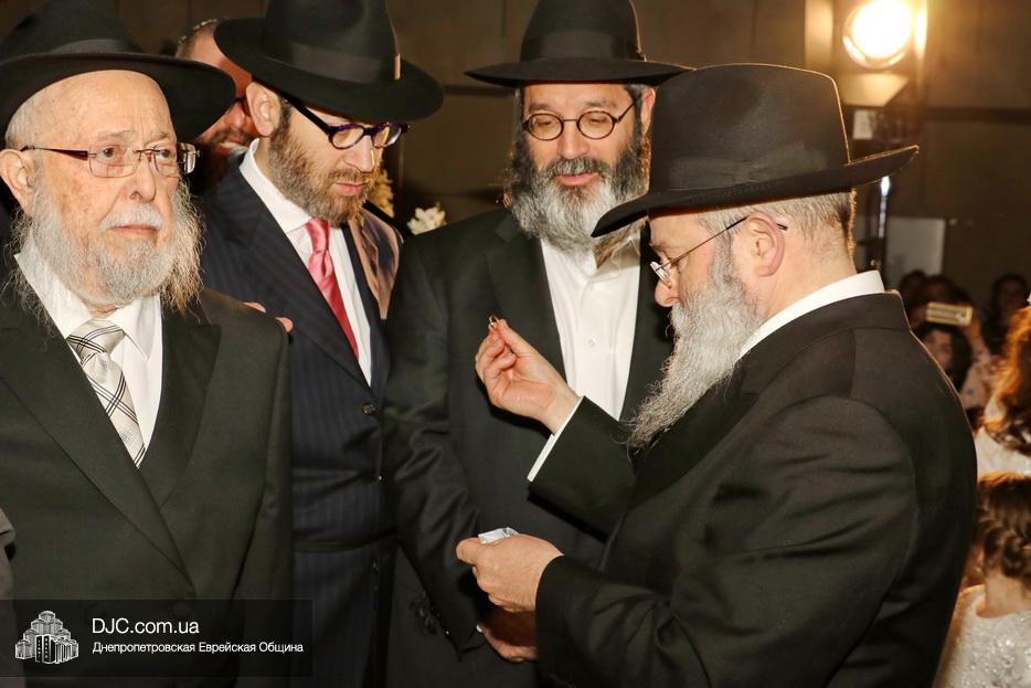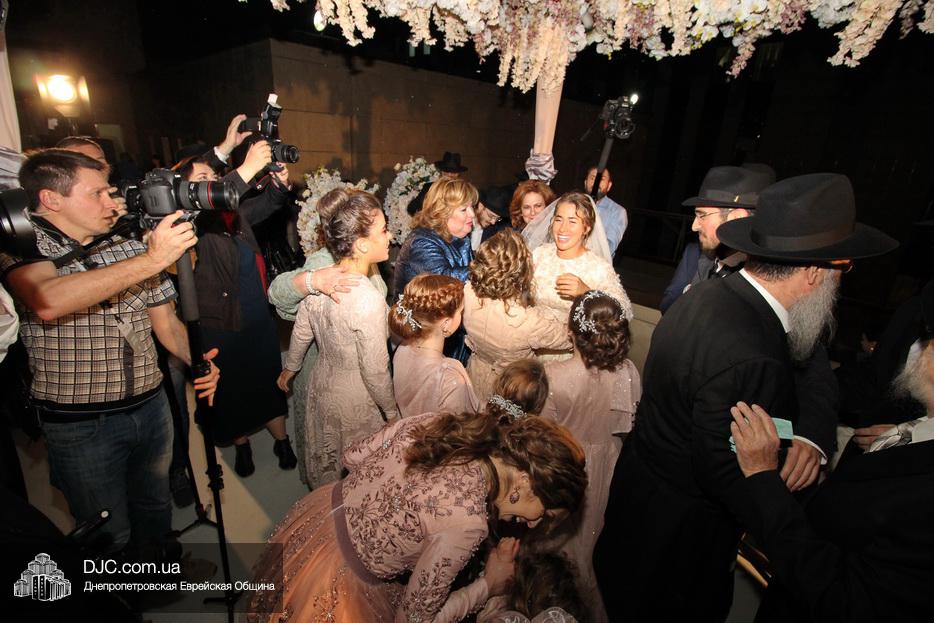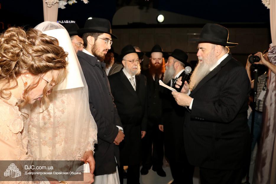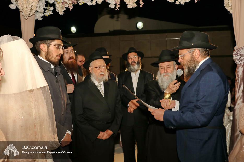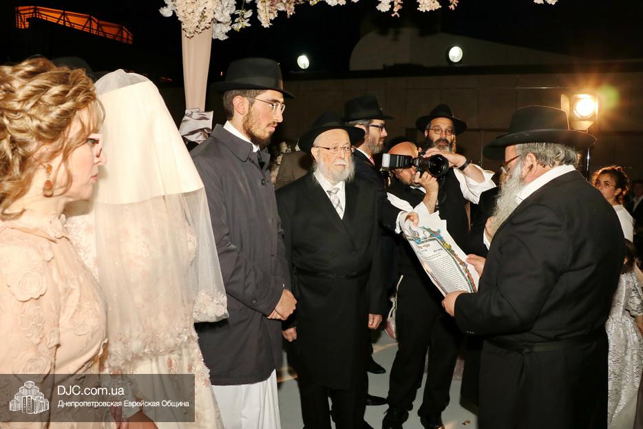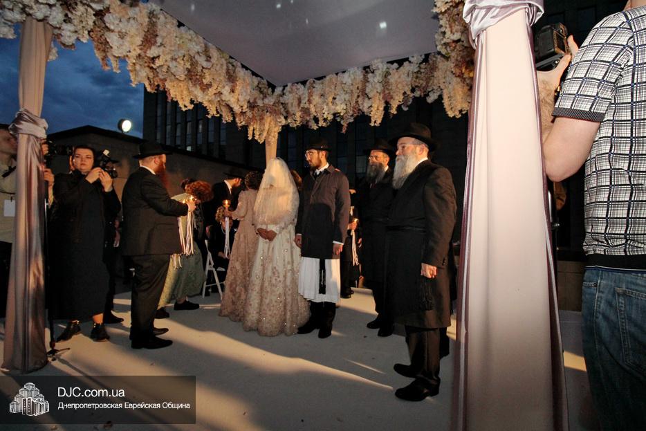 Затем невесту семь раз обвели вокруг жениха, стоящего под Хупой, под звуки традиционного гимна «Арба Бавот», далее свадебный гимн «Ми Адир» исполнил муж сестры невесты раввин Йосеф Ицхак Кляйн; письмо-благословение Любавического Ребе прочел один из самых известных лидеров Всемирного движения «ХаБаД Любавич», глава службы посланников во всем мире, руководитель Всемирного центра еврейского образования «Мерказ Лионей Хинух», раввин Мойше Котлярский; а перевод прочел Председатель Совета «Федерации еврейских общин Украины», Президент МГПИ «Бейт Хана», член Попечительского Совета еврейской общины Днепра, раввин Меир Цви Стамблер.