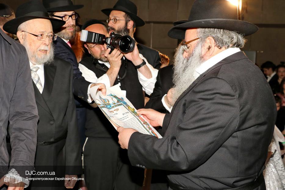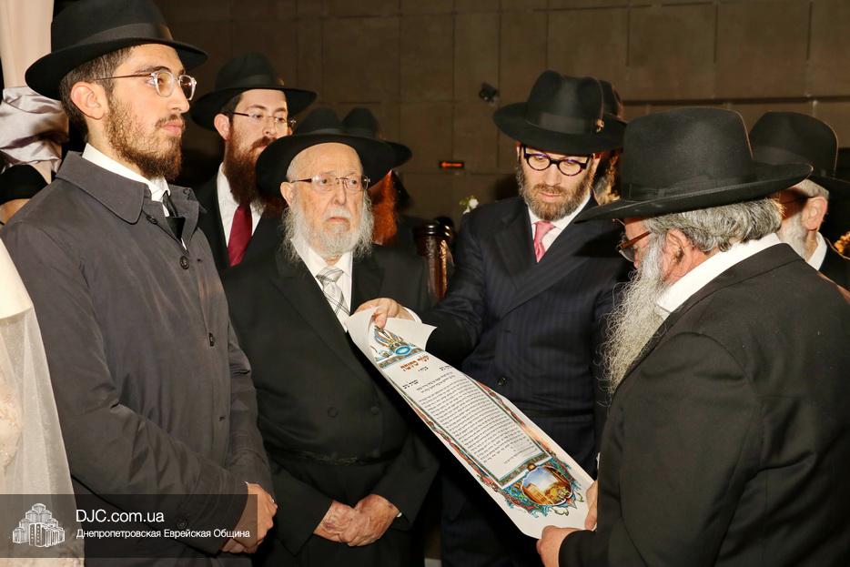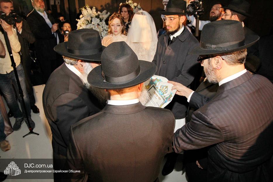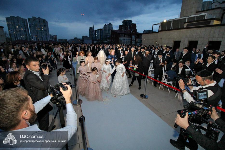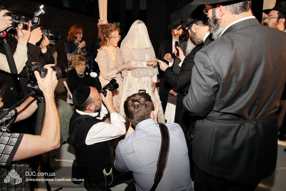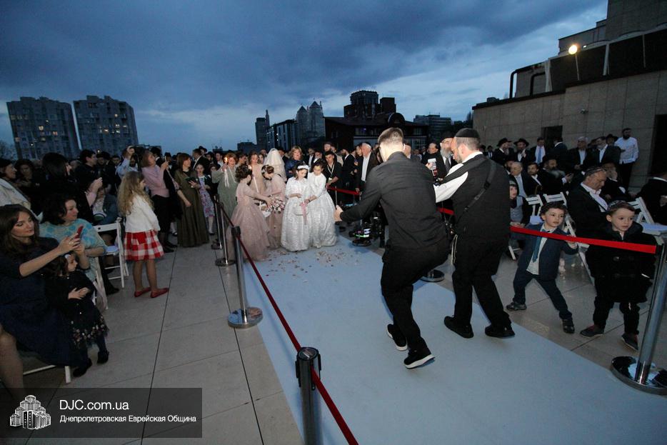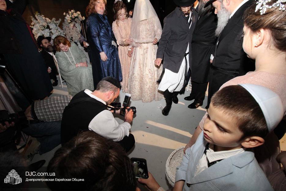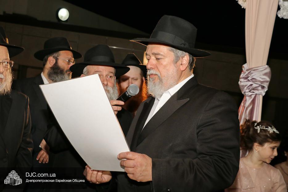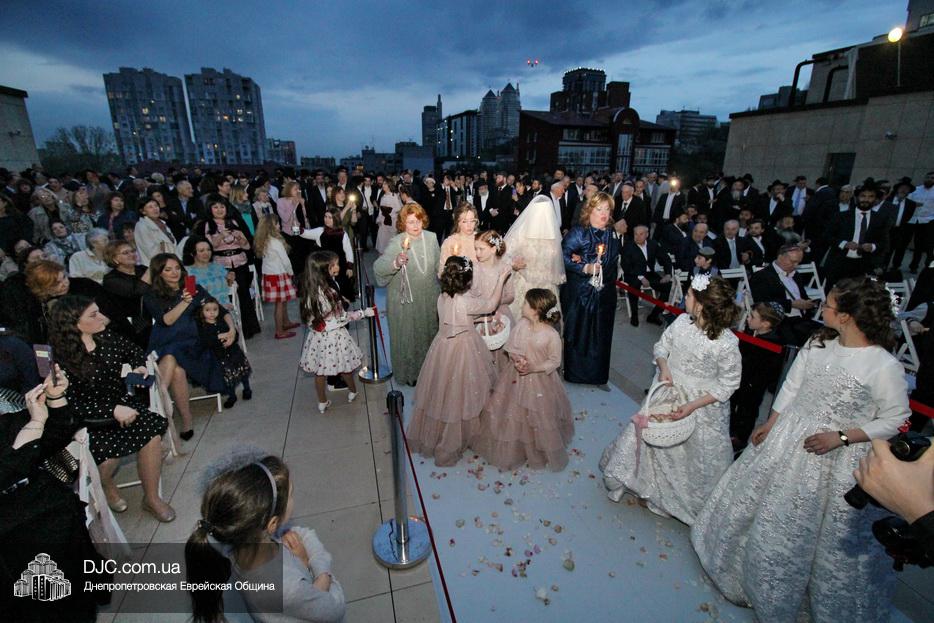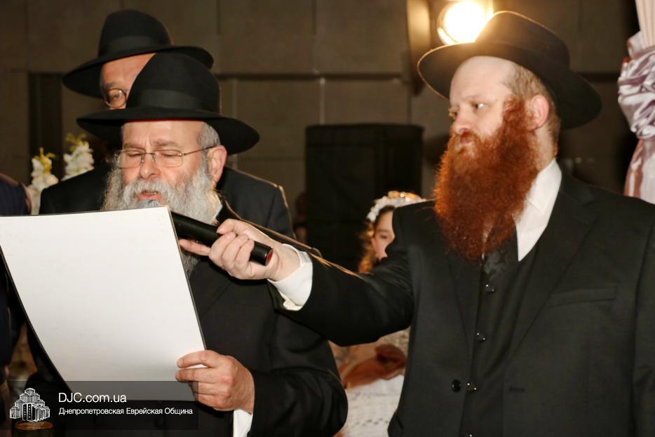 Затем невесту семь раз обвели вокруг жениха, стоящего под Хупой, под звуки традиционного гимна «Арба Бавот», далее свадебный гимн «Ми Адир» исполнил муж сестры невесты раввин Йосеф Ицхак Кляйн; письмо-благословение Любавического Ребе прочел один из самых известных лидеров Всемирного движения «ХаБаД Любавич», глава службы посланников во всем мире, руководитель Всемирного центра еврейского образования «Мерказ Лионей Хинух», раввин Мойше Котлярский; а перевод прочел Председатель Совета «Федерации еврейских общин Украины», Президент МГПИ «Бейт Хана», член Попечительского Совета еврейской общины Днепра, раввин Меир Цви Стамблер.