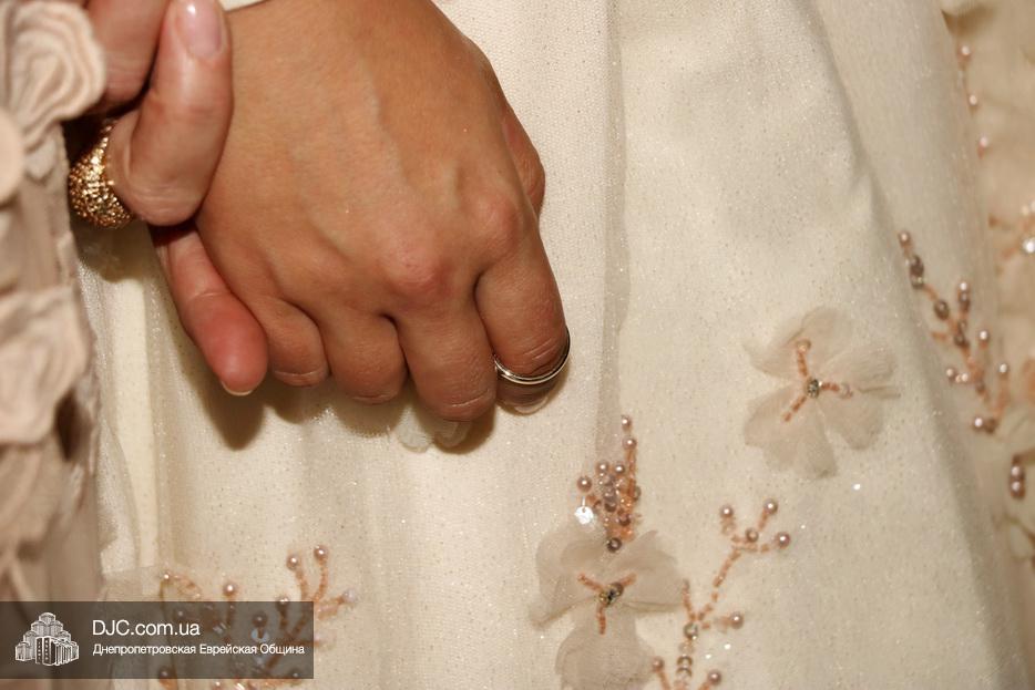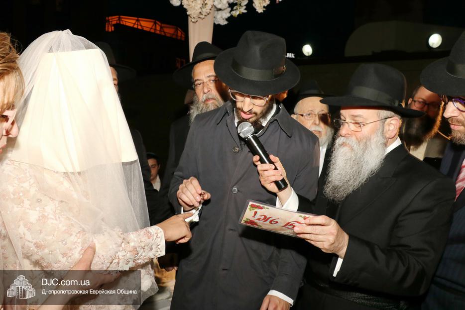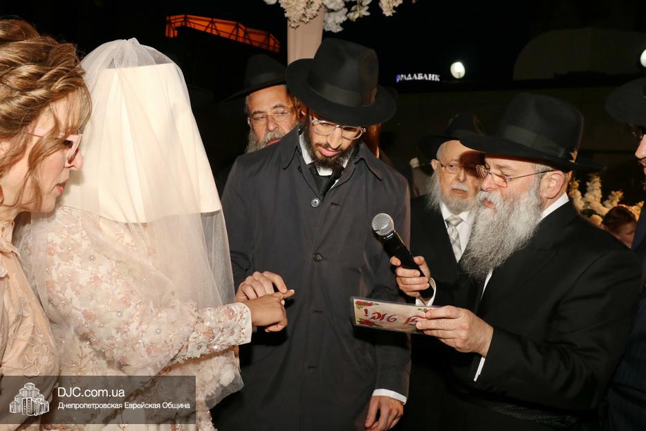 После того, как раввин Каминецкий прочитал благословение на вино и благословение на совершение бракосочетания, пригодность золотого кольца для проведения свадебной церемонии засвидетельствовали раввин Шломо Перес и посланник в Киеве раввин Рафаэль Рутман. Затем жених, произнеся ритуальный текст, надел кольцо на указательный палец невесты.