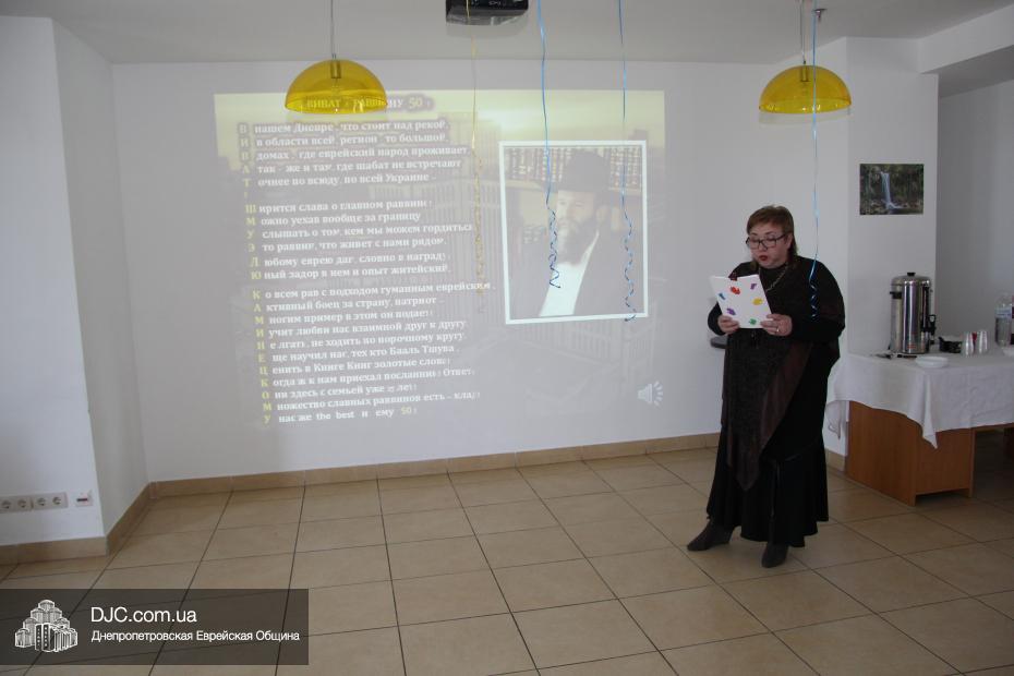 К пятилетию клуба Юлия Белая подготовила презентацию о его деятельности и наиболее ярких событиях в его истории, а активистка «Баалей Тшувы» Крейна-Сара Фролова прочитала свой акростих, написанный в честь 50-летия Главного раввина Днепропетровска и региона Шмуэля Каминецкого. Большое внимание было уделено тем, кого в «Баалей Тшува» называют «наши Учителя». В их адрес прозвучали слова искренней благодарности за увлекательные лекции и занятия, позволяющие женщинам вернуться к своим корням, приблизиться к Торе и заповедям.