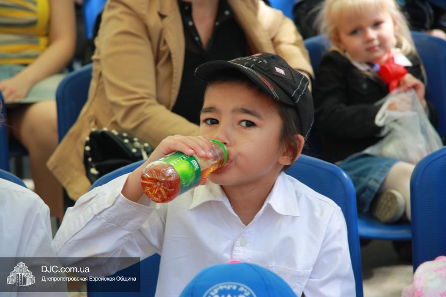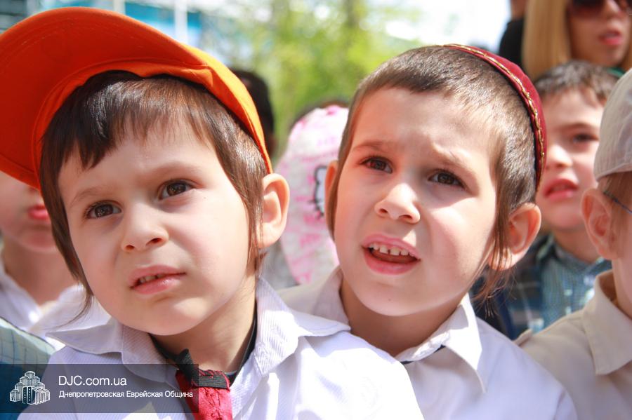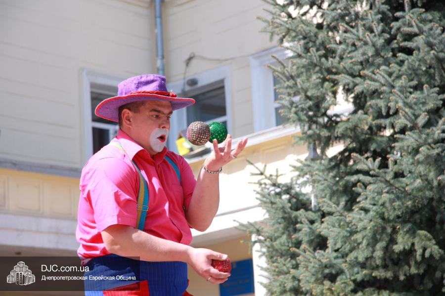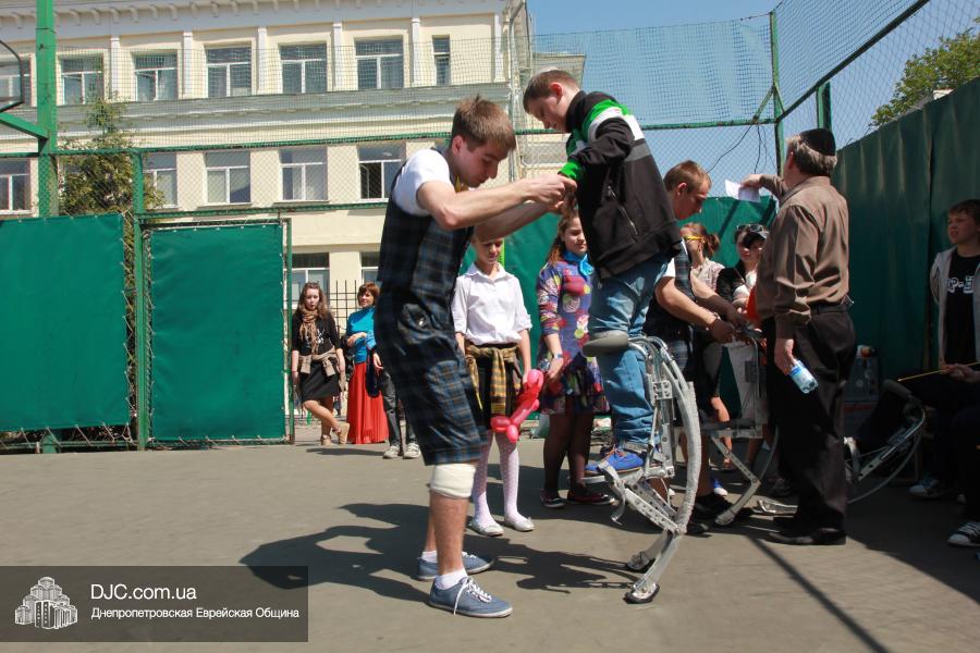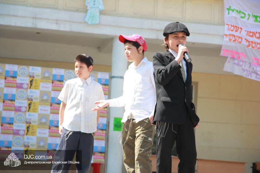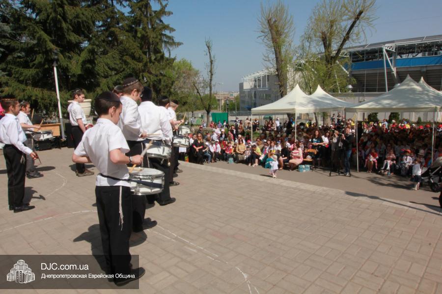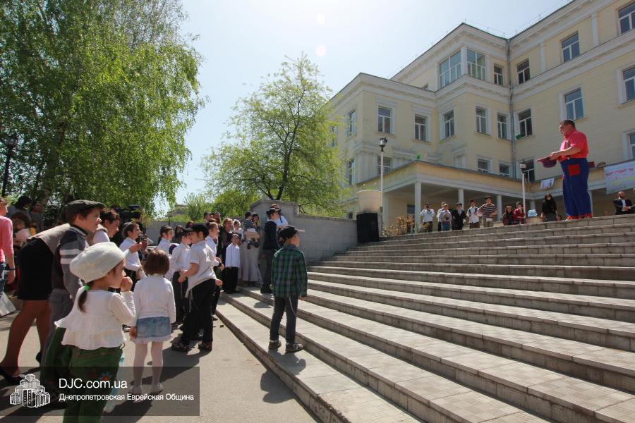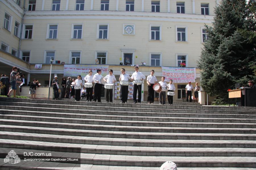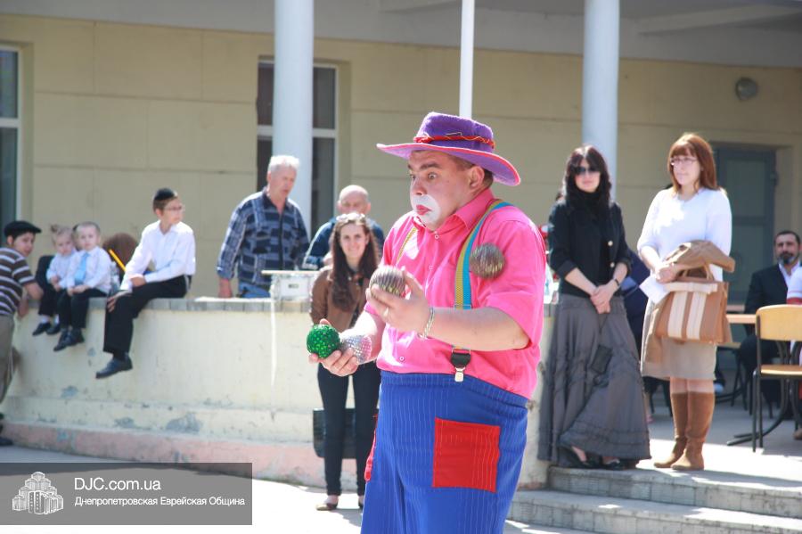 Затем последовало выступление сводного оркестра барабанщиков – воспитанников днепропетровской иешивы, которые подготовили к празднику несколько композиций, сыгранных ритмично и слаженно. Продолжили праздник традиционные «12 Псуким», которые произнесли также ученики иешивы-ктана. Чтение псуким дружно поддержали все гости мероприятия. Воспитанницы «Бейт Циндлихт» продолжили концерт танцевальным номером, который они подготовили с помощью своих преподавателей, а завершил его клоун Шурик – неизменный гость многих детских празднеств, проводимых в еврейской школе.