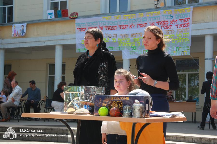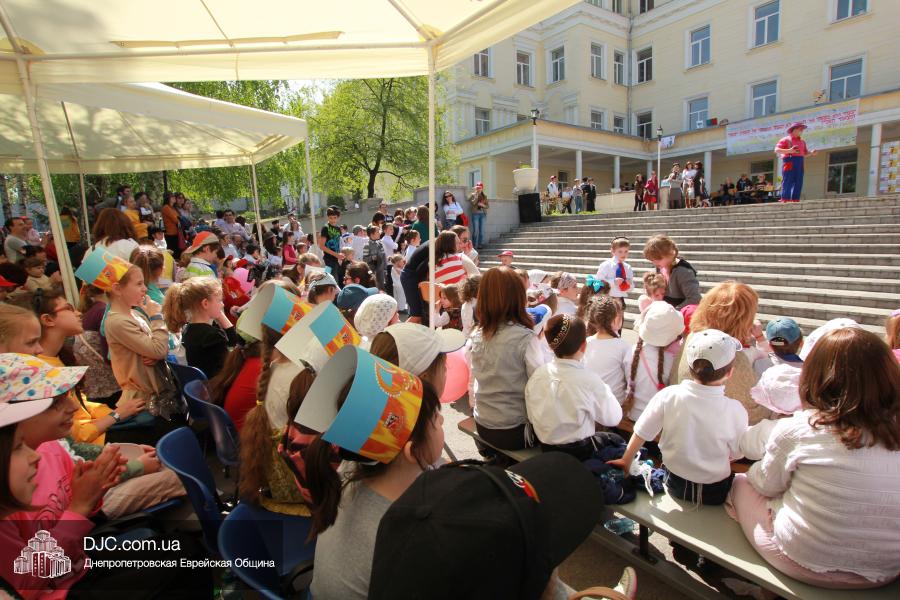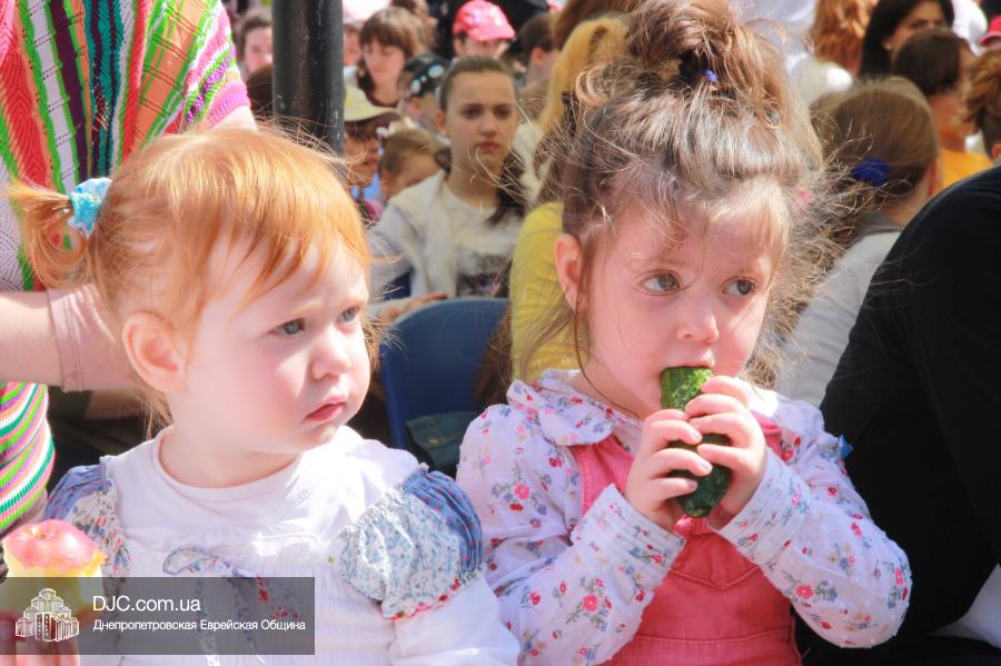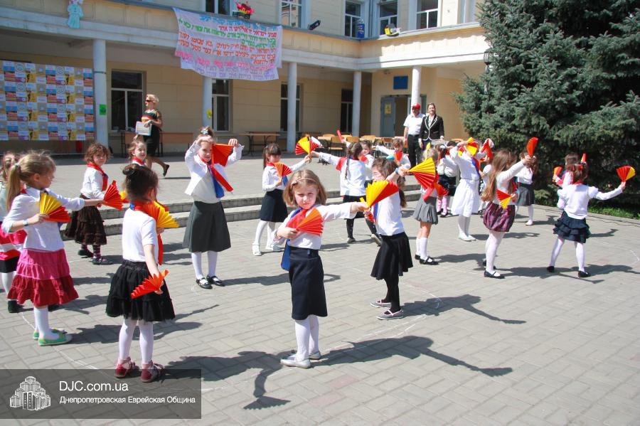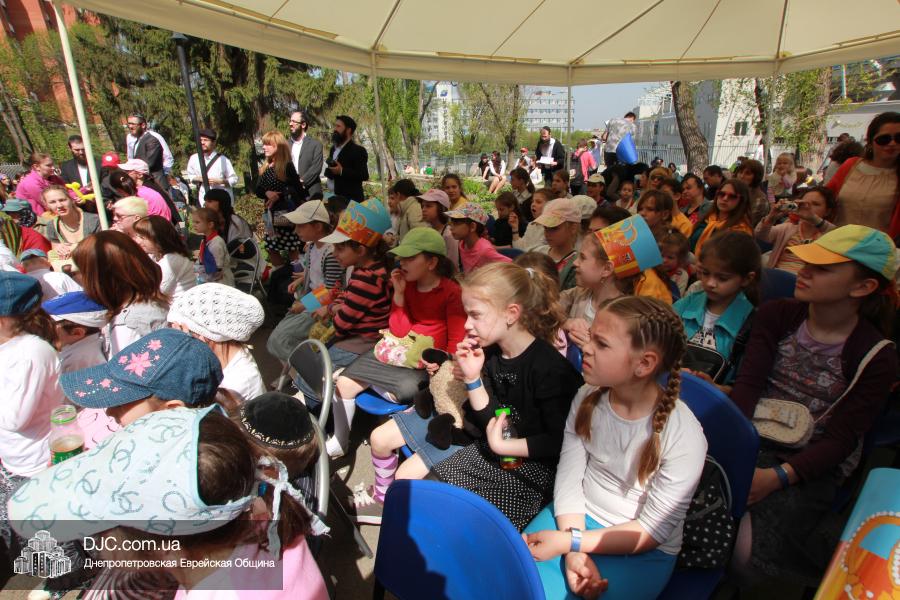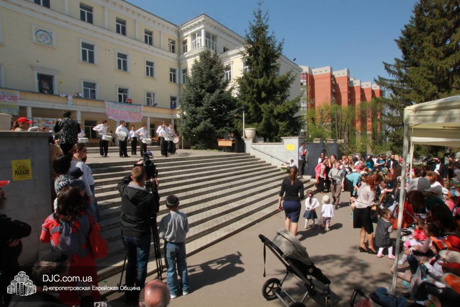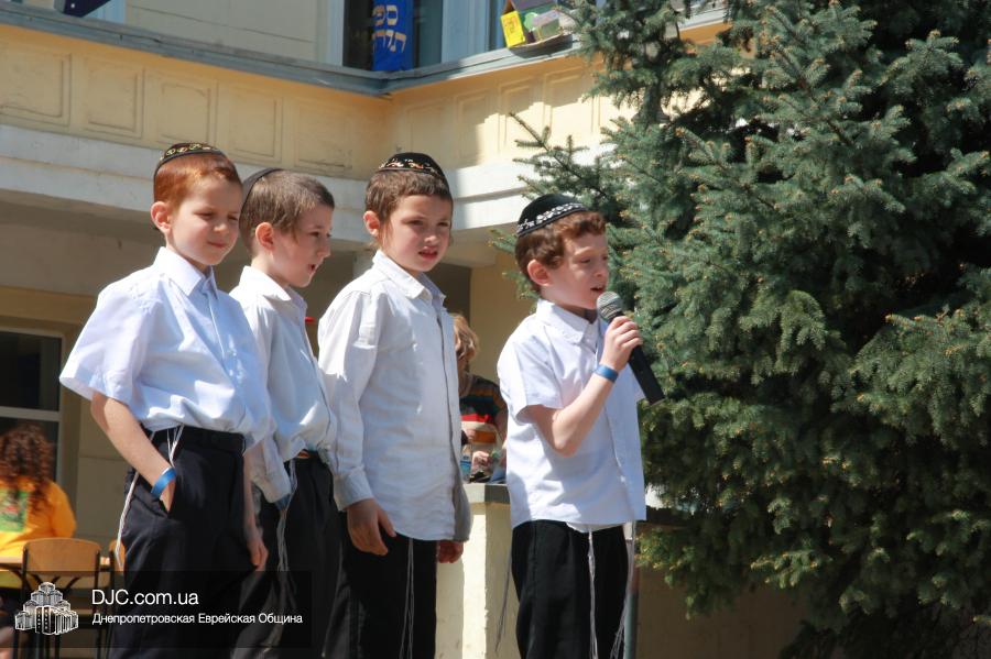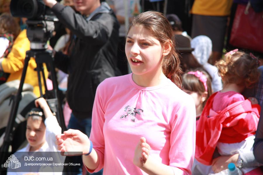 Затем последовало выступление сводного оркестра барабанщиков – воспитанников днепропетровской иешивы, которые подготовили к празднику несколько композиций, сыгранных ритмично и слаженно. Продолжили праздник традиционные «12 Псуким», которые произнесли также ученики иешивы-ктана. Чтение псуким дружно поддержали все гости мероприятия. Воспитанницы «Бейт Циндлихт» продолжили концерт танцевальным номером, который они подготовили с помощью своих преподавателей, а завершил его клоун Шурик – неизменный гость многих детских празднеств, проводимых в еврейской школе.