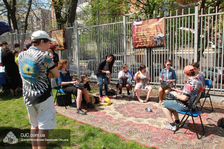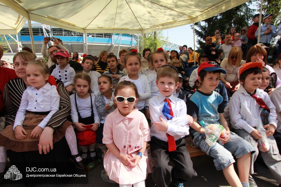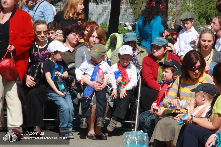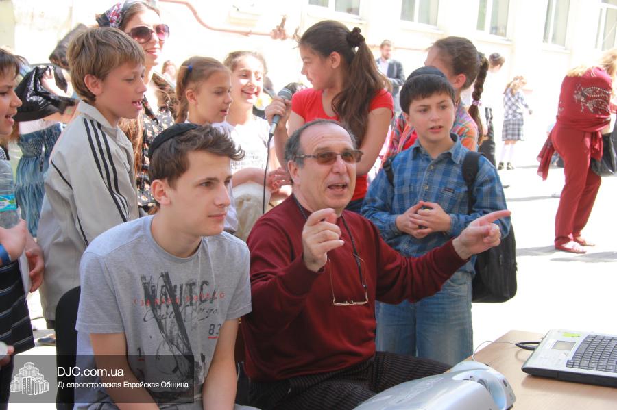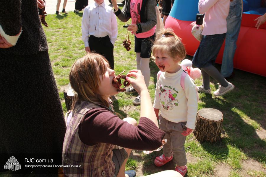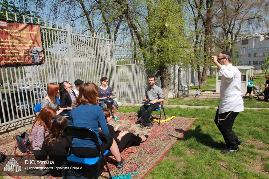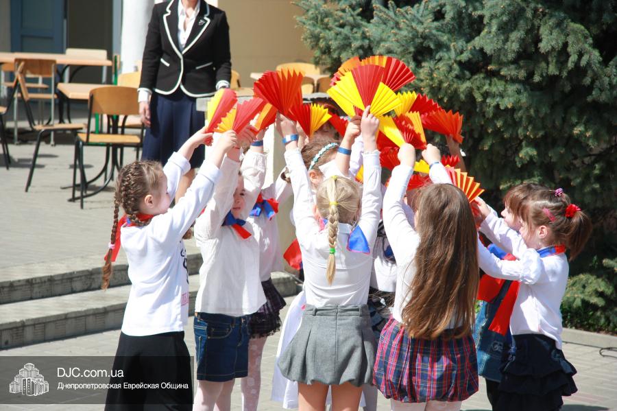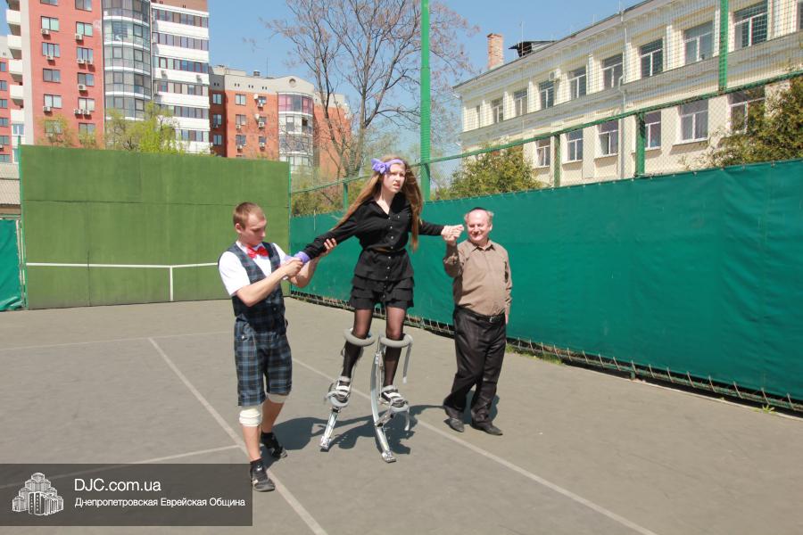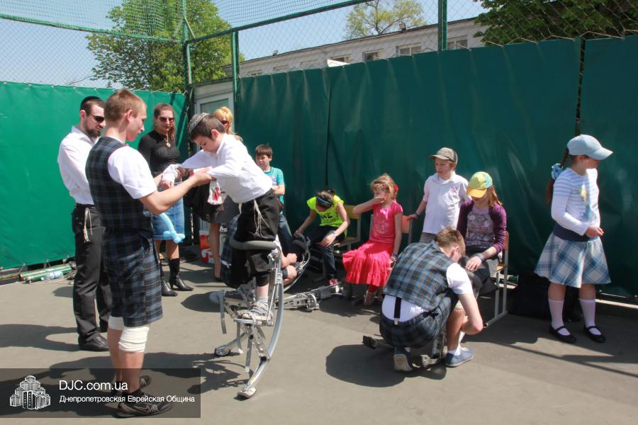 Затем последовало выступление сводного оркестра барабанщиков – воспитанников днепропетровской иешивы, которые подготовили к празднику несколько композиций, сыгранных ритмично и слаженно. Продолжили праздник традиционные «12 Псуким», которые произнесли также ученики иешивы-ктана. Чтение псуким дружно поддержали все гости мероприятия. Воспитанницы «Бейт Циндлихт» продолжили концерт танцевальным номером, который они подготовили с помощью своих преподавателей, а завершил его клоун Шурик – неизменный гость многих детских празднеств, проводимых в еврейской школе.