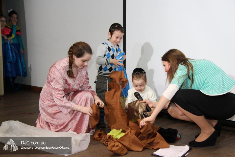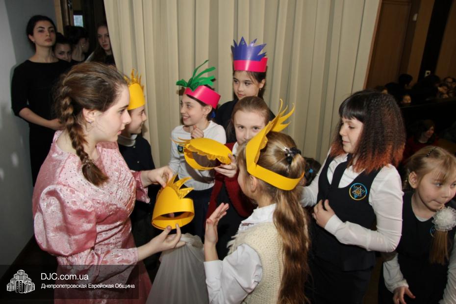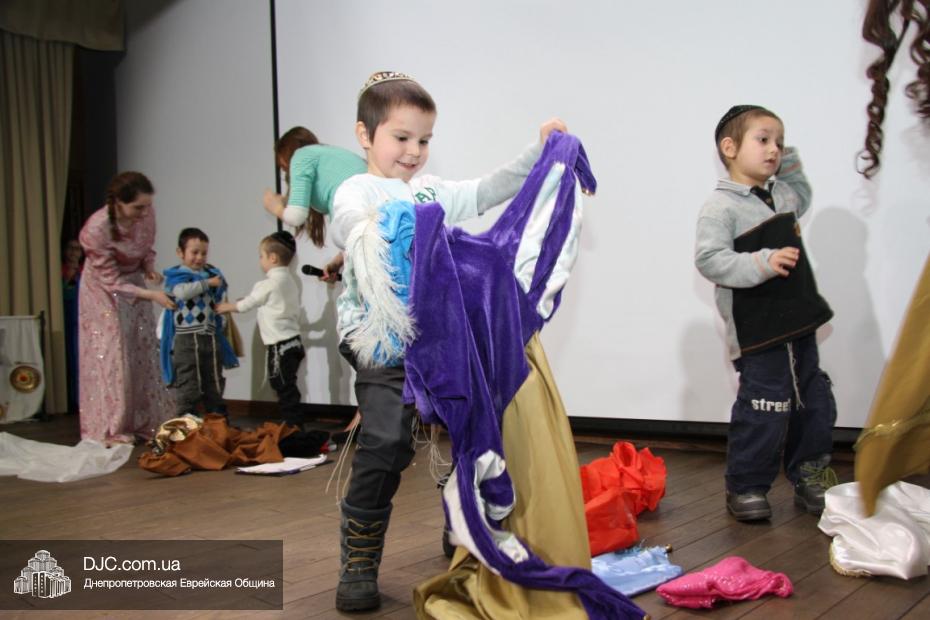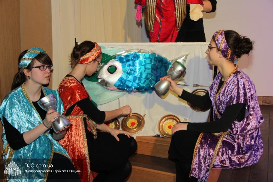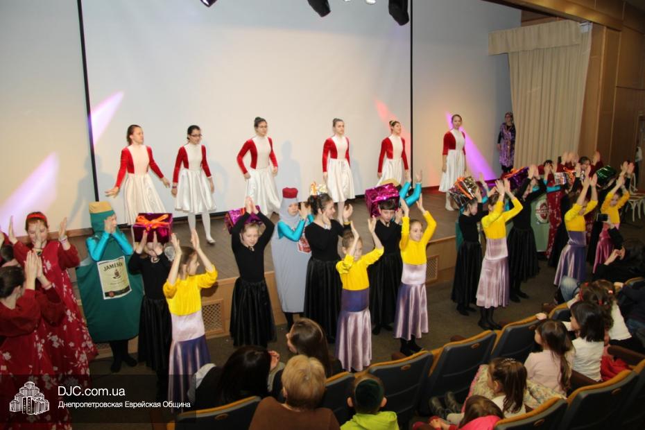 В соответствии с традицией вспоминать историю праздника максимально коротко и максимально весело, девушки представили традиционный пуримшпиль, в который органично вплели и красочные костюмы, и песни, и танцы, и конкурсы. И, как всегда, праздник махона «Бейс Хая-Мушка» получился очень музыкальным – ведь музыке и хореографии в программе обучения и воспитания еврейских «принцесс» отводится особое место. Так, в одном из конкурсов зрительницы смогли принять участие в «конкурсе красоты для принцесс», в другом – юные гости праздника на скорость должны были переодеться в царей. Также проходили конкурсы и для всего зала: большие мягкие кубики нужно было выбросить на сцену с максимальным результатом, и, конечно, наибольший восторг зрителей вызвало «хоровое» чтение отрывков из свитка Эстер – какая половина зала громче.