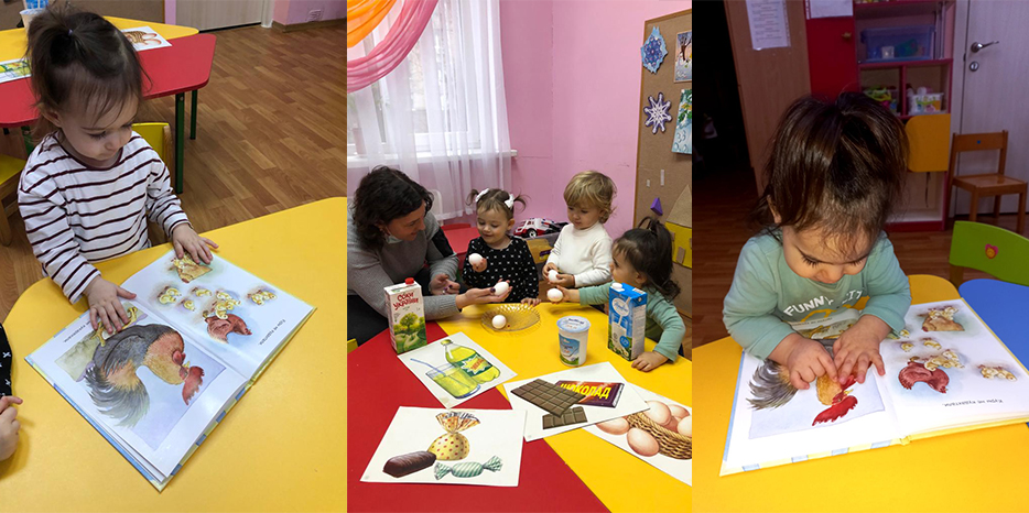 Например, на этой неделе мы учили благословение, которое говорится на все нерастительные виды пищи и на все напитки, кроме виноградных. Но наши воспитанники очень маленькие, поэтому кроме изучения благословения мы также знакомились с окружающим нас миром. Воспитатели вместе с малышами смотрели картинки, на которых были изображены те виды продуктов, на которые необходимо читать «Шеаколь», пробовали на вкус сок и молоко, а также с кухни нам принесли куриные яйца, которые мы вместе смогли рассмотреть, потрогать и даже зарисовать.