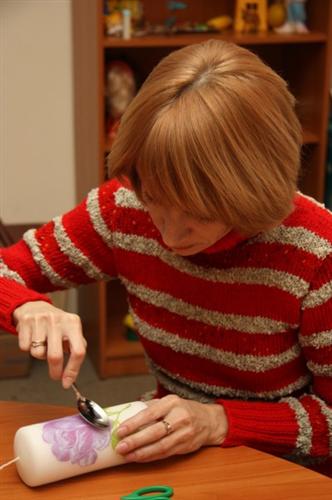 Всем присутствующим очень понравилось, как просто и эффективно можно закрепить вырезанный рисунок на гладкой поверхности свечи: достаточно хорошо прогреть ложку, например, на огне другой свечи, и тщательно разгладить рисунок на поверхности так, чтобы он вплавился и стал единым целым со всей свечой. Получается очень красиво и оригинально, хотя, конечно, требует времени, тщательности и усидчивости.