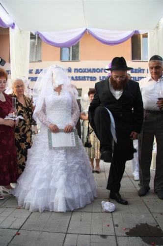 В завершение официальной церемонии жених правой ногой разбил бокал, над которым звучали все благословения, в память о том, что никакое веселье не может быть полным, пока не отстроен Храм на горе Мория в Иерусалиме.