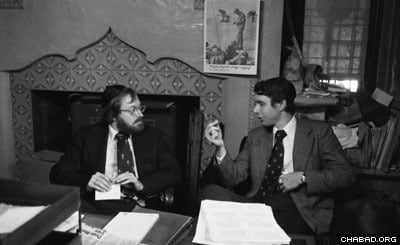 Кардиологи Айра Вайс (Справа) и Луи Тейхольц совещаются в офисе секретариата Ребе.