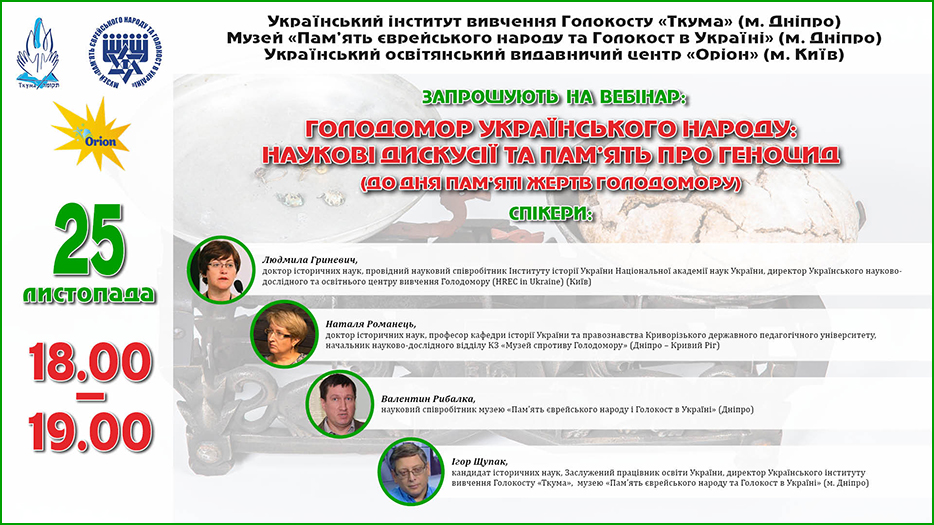 25 листопада 2020 р. о 18.00розпочнеться «Історичний вебінар» «Голодомор українського народу: наукові дискусії та пам’ять про геноцид». У заході братимуть участь відомі науковці: проф. Людмила Гриневич (Інститут історії України Національної академії наук України, Український науково-дослідний та освітній центр вивчення Голодомору (HREC in Ukraine)), проф. Наталя Романець (Музей спротиву Голодомору, Криворізький державний педагогічний університет), Валентин Рибалка (Музей «Пам’ять єврейського народу та Голокост в Україні», Український інститут вивчення Голокосту «Ткума»), д-р Ігор Щупак (Музей «Пам’ять єврейського народу та Голокост в Україні», Український інститут вивчення Голокосту «Ткума»).