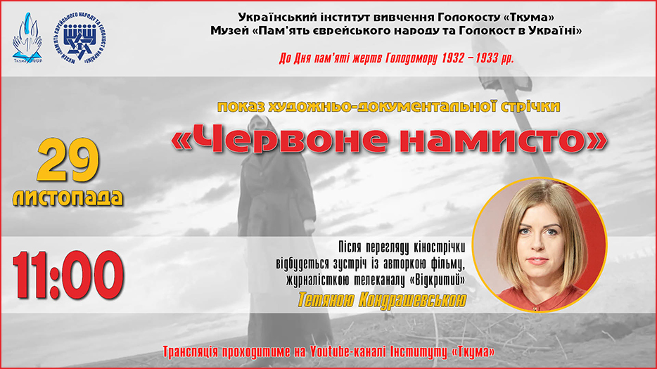 29 листопада 2020 р. об 11.00відбудеться перегляд художньо-документальної стрічки «Червоне намисто», присвяченої долі української родини в роки Голодомору. Після перегляду кінострічки пройде зустріч із авторкою фільму, журналісткою телеканалу «Відкритий» Тетяною Кондрашевською.