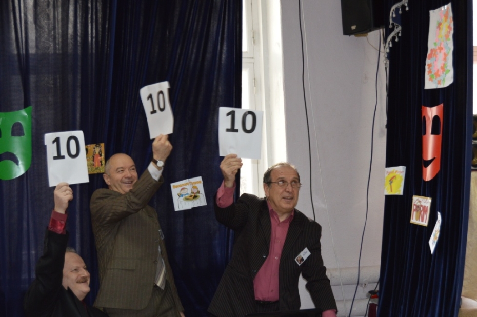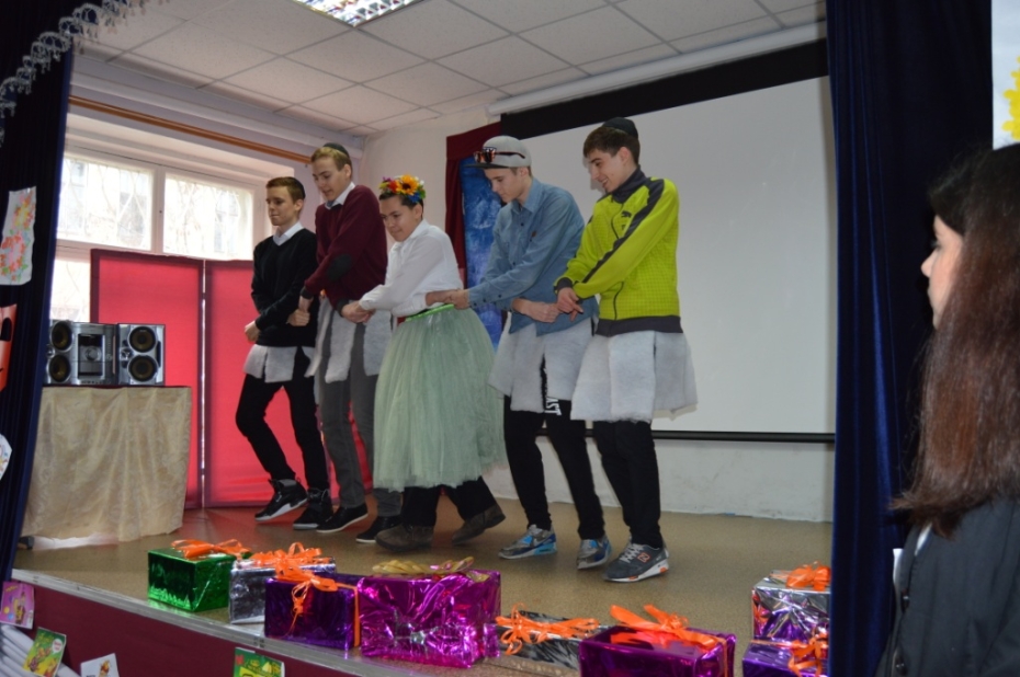 Задача каждой конкурсантки вовсе не отличалась от конкурсов красоты мирового масштаба. Первый этап – знакомство с участницами, а второй – тематическое дефиле. Скромничать не будем: каждая конкурсантка сразила наше жюри своим неповторимым образом «на повал»! В перерывах между выступлениями участниц конкурса «Мисс Уймись» перед зрителями выступили ученики 1-а класса с веселой композицией «Песенка капель», джентльмены 3-б класса с юмористическими стихотворениями, вокальный коллектив «Голдене Киндерлах» с песней, посвященной всем мамам. Далее последовало шуточное поздравление от 5-б класса, выступление в стиле «Камеди Клаб» от мальчиков 9-а класса и незабываемый танец маленьких лебедей от балеронов из 10-а класса. Еще одним сюрпризом для зрительного зала стало музыкальное выступление членов жюри в честь предстоящего Международного женского дня.