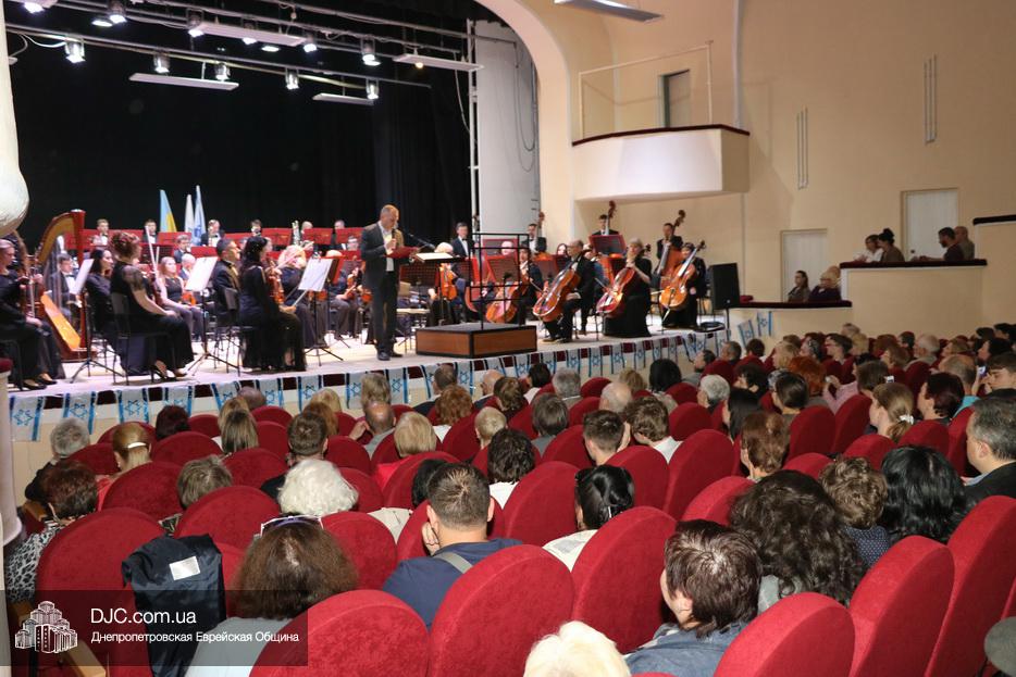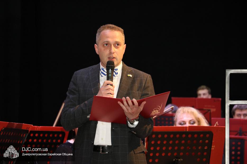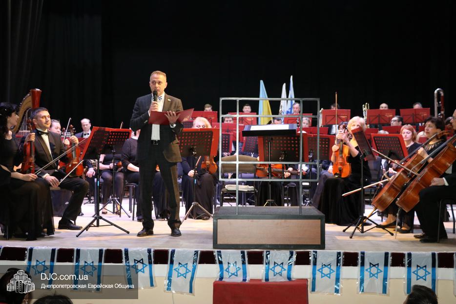 Перед началом концерта, после исполнения оркестром гимнов Украины и Израиля, днепрян и гостей города тепло поздравил Второй секретарь Посольства государства Израиль в Украине, директор Израильского Центра в Днепре Вячеслав Смоткин.