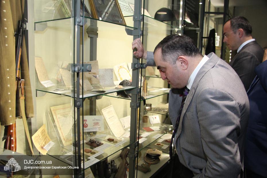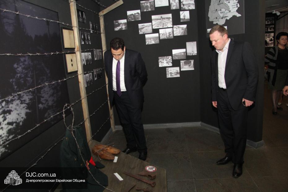 Высокий гость вместе с председателем Днепропетровского Областного совета Евгением Удодом, заместителем председателя облгосадминистрации Святославом Олейником и другими сопровождающими его лицами, осмотрел крупнейший в мире еврейский центр «Менора», уделив особое внимание музею «Память еврейского народа и Холокост в Украине». Обзорную экскурсию для гостей провела Анна Медведовская, руководитель научного отдела УИИХ «Ткума», ведущий научный сотрудник музея, которая рассказала о концепции и структуре музея, представляющего как многообразие еврейской жизни в Украине до Второй Мировой войны, так и истоки процесса и последствия Холокоста, одной из величайших трагедий в истории человечества.