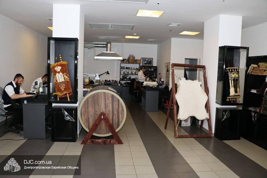 Знаменитый «Национальный центр софрута» в Днепре завершает переезд в новое помещение. Официального открытия еще не было, но работа мастеров сойферского искусства продолжается, а, кроме того, центр расширяет направление своей деятельности, добавляя к ней просветительскую функцию. Теперь «Национальный центр софрута» находится на первом этаже центра Менора и одновременно возле главного молитвенного зала синагоги «Золотая Роза» – вход в него из нового придела молитвенного зала.