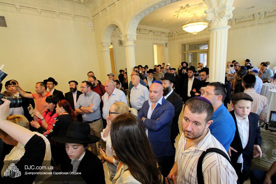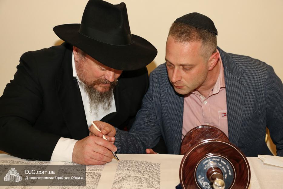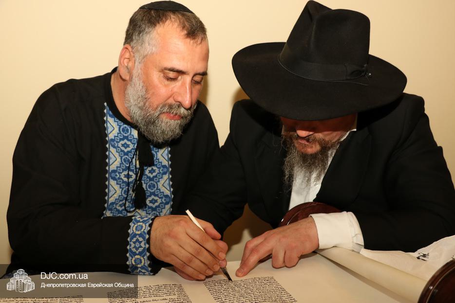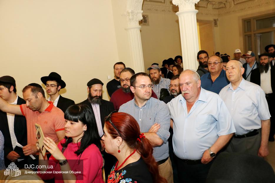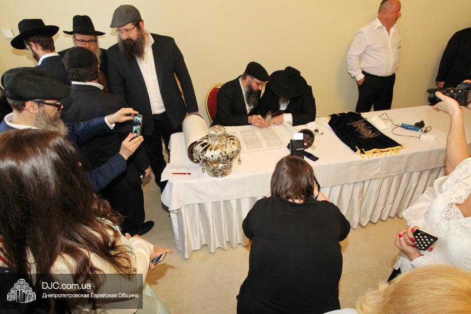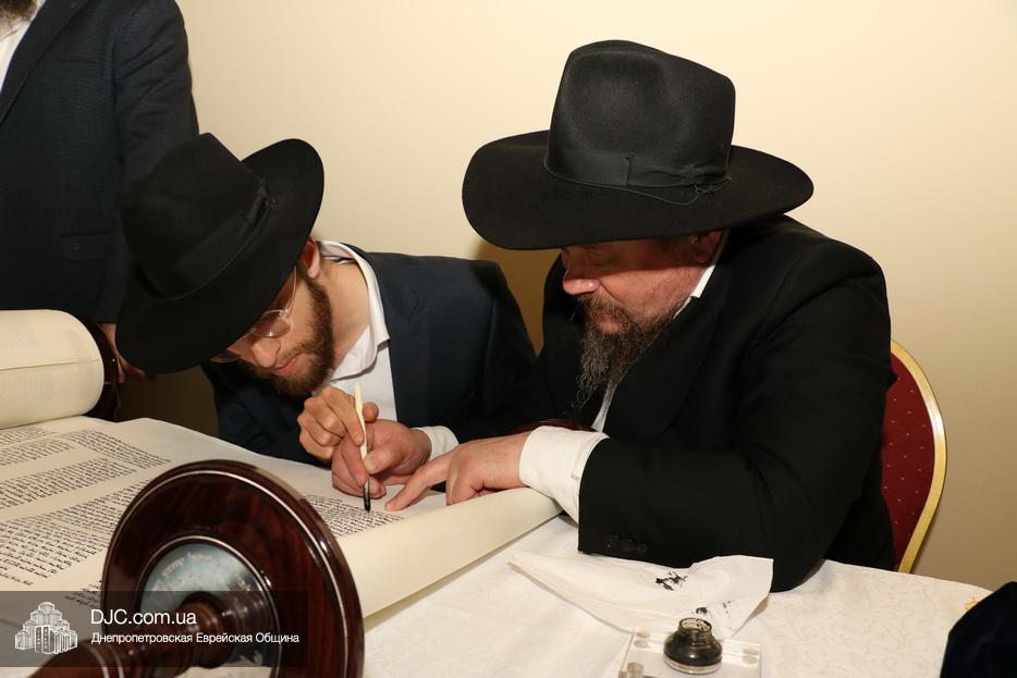 Ведущий – Цви Гирш Виноградов, вызывал уважаемых гостей и они, вместе с Главным сойфером «Национального Сойферского Центра Украины» раввином Реувеном Марголиным, вписывали свою букву в Свиток Торы. Честь начать Завершение Свитка была предоставлена Второму секретарю Посольства государства Израиль в Украине, директору Израильского Центра в Днепре Вячеславу Смоткину.