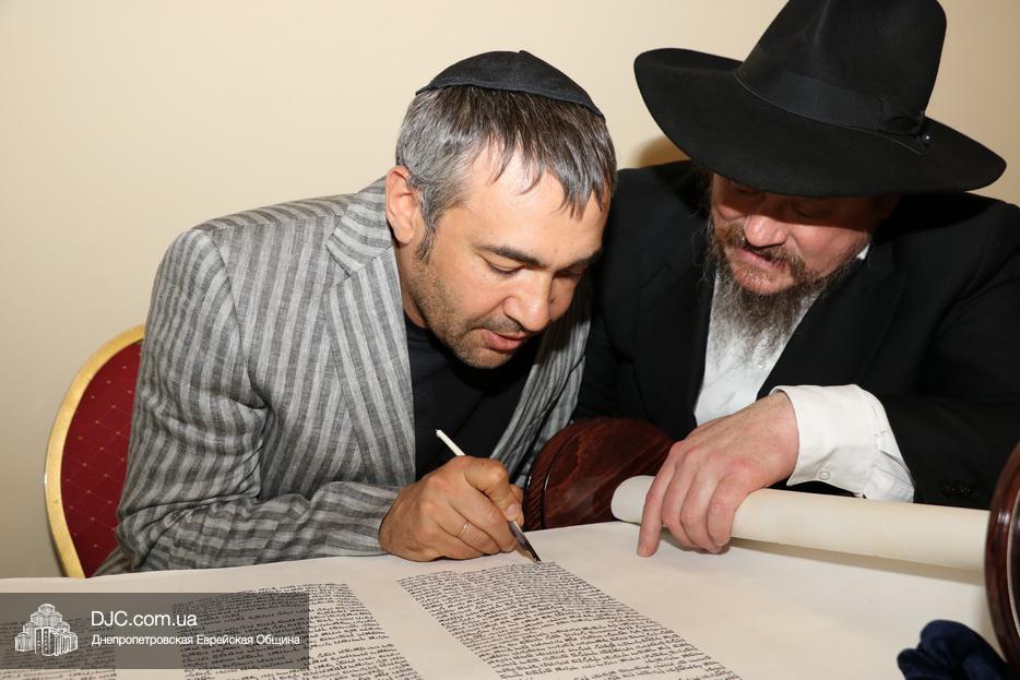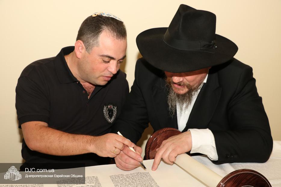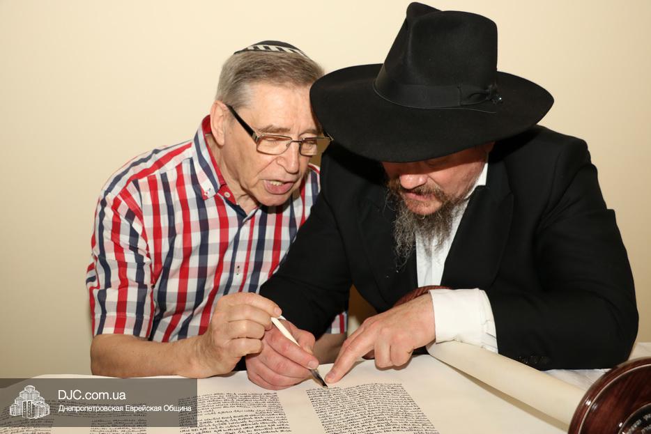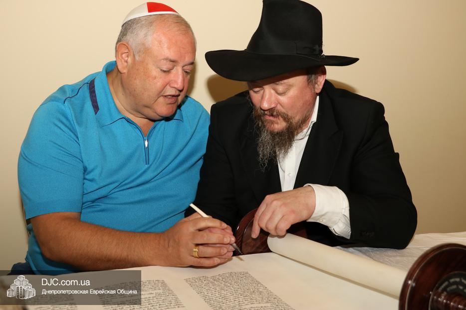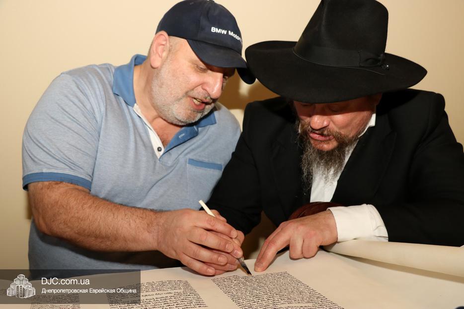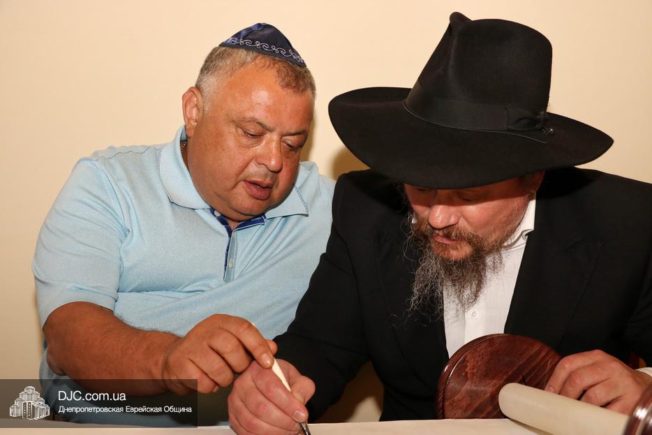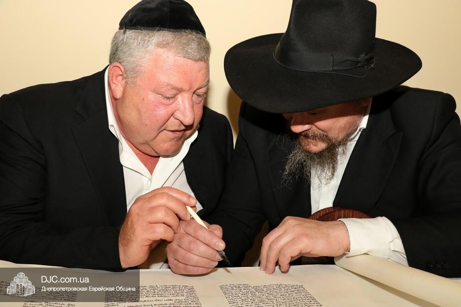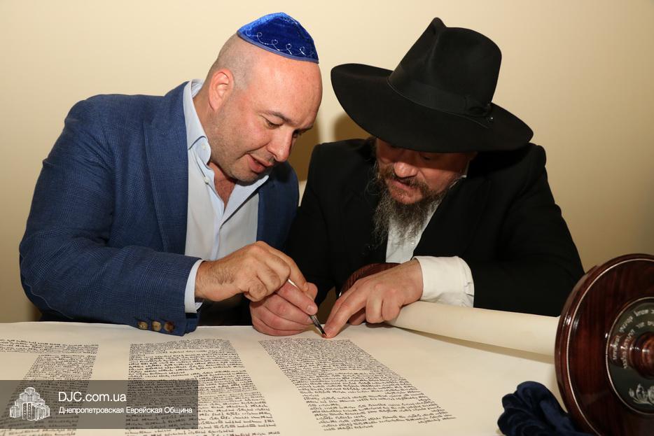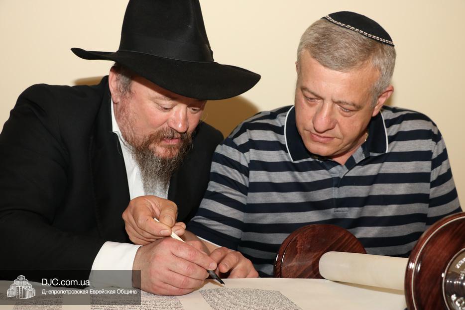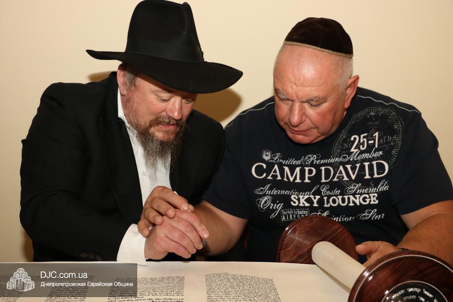 В еврейской общине Днепра прошла церемония Завершения и Внесения нового Свитка Торы, который был написан благодаря щедрости членов Попечительского Совета Вячеслава Львовича (Рувена) Капустина и Александра Павловича (Авраама) Рутмана и их друга и партнера Александра Михайловича (Лейбы) Кушнира.
