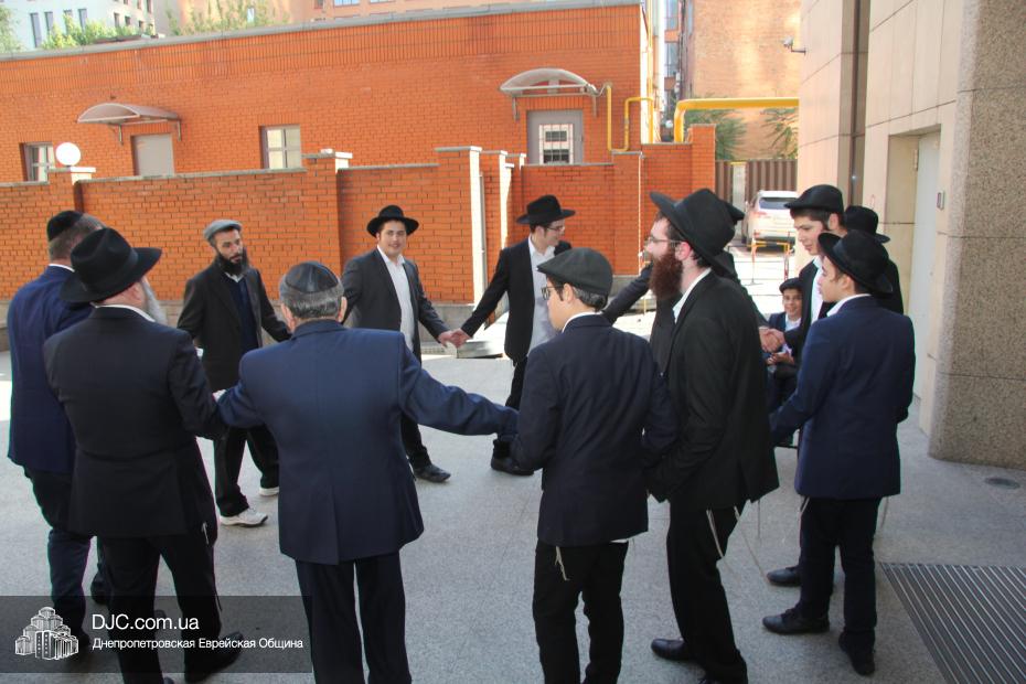 После того, как был разбит стакан и веселые танцы и поздравления отметили это радостное событие, прошла церемония трубления в шофар – последняя перед наступлением Рош А Шана, которую провел Залман Бухиник. Все присутствовавшие пожелали молодым, вступающим в новый 5777 год в статусе мужа и жены, согласно предписаниям еврейского закона, долгих и счастливых лет совместной жизни, чтобы они хорошо погуляли на свадьбах своих правнуков!