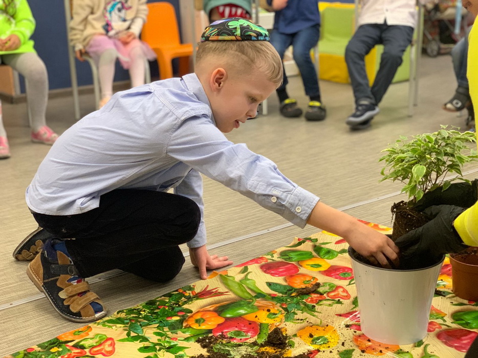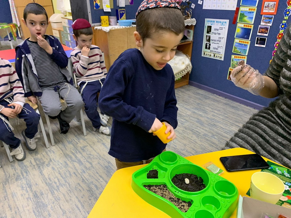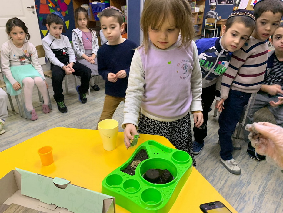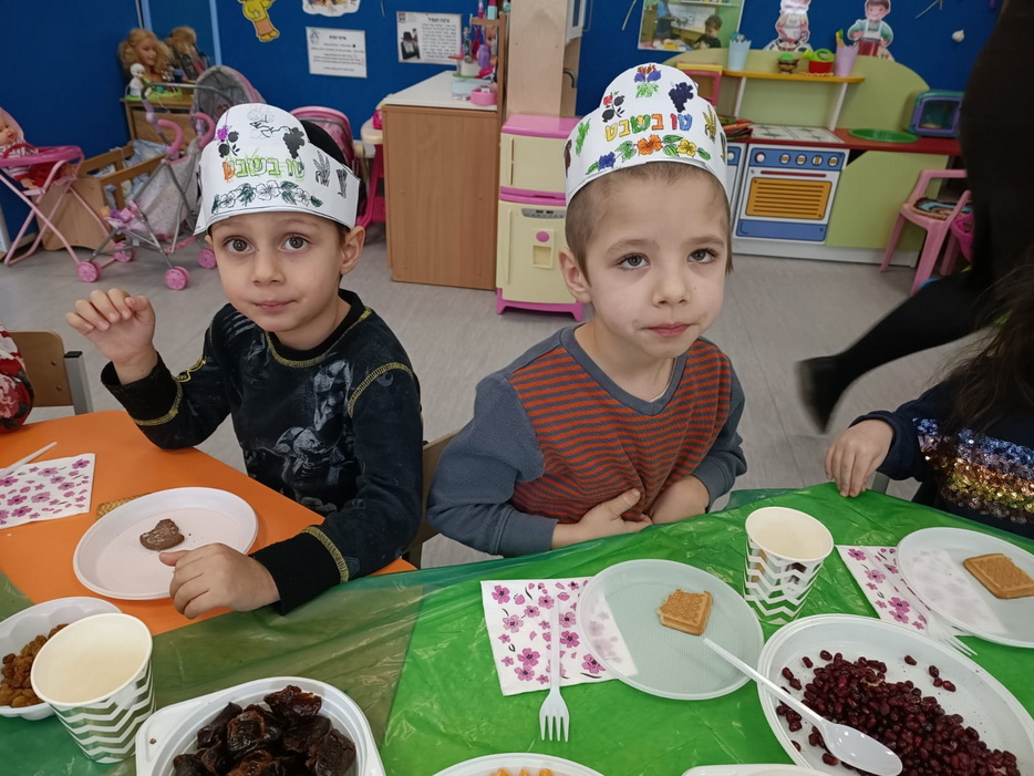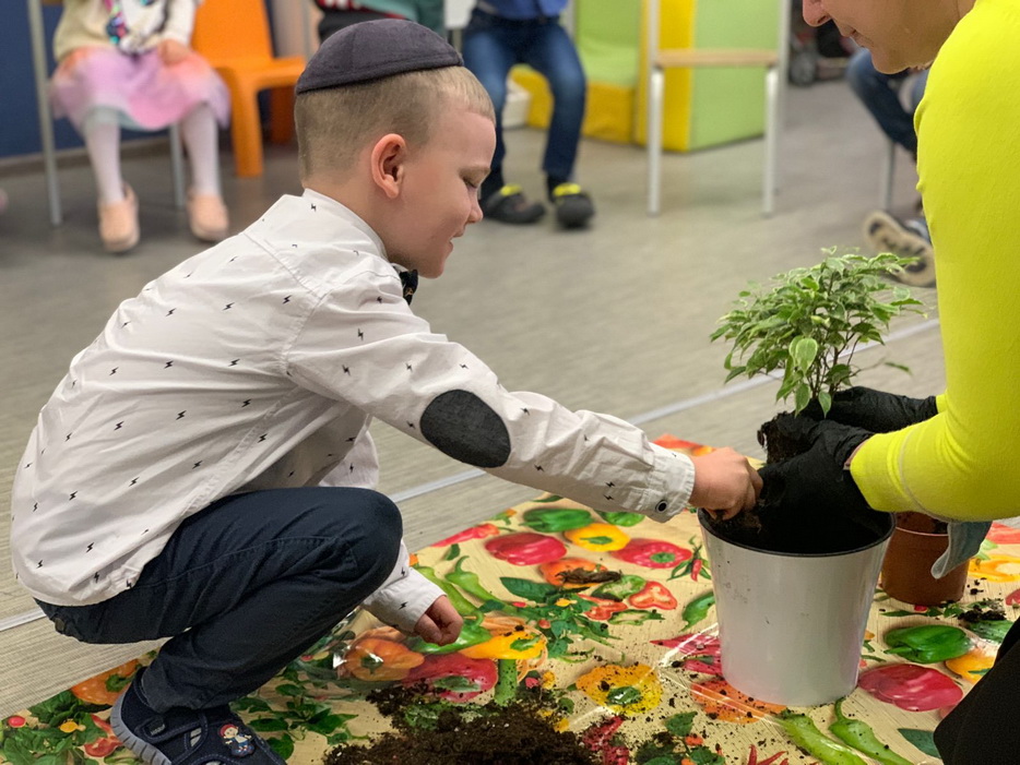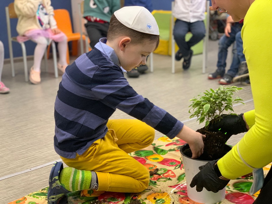 В интересной, игровой и увлекательной форме малыши знакомились с праздником Ту Би Шват, говорили о деревьях, о семи плодах Израиля, рисовали, пели, танцевали и делали себе короны, поздравляя деревья с Новым годом. Однако большим удовольствием для наших воспитанников стала возможность «посадить свое растение», дети имели возможность посадить лук или фасоль.