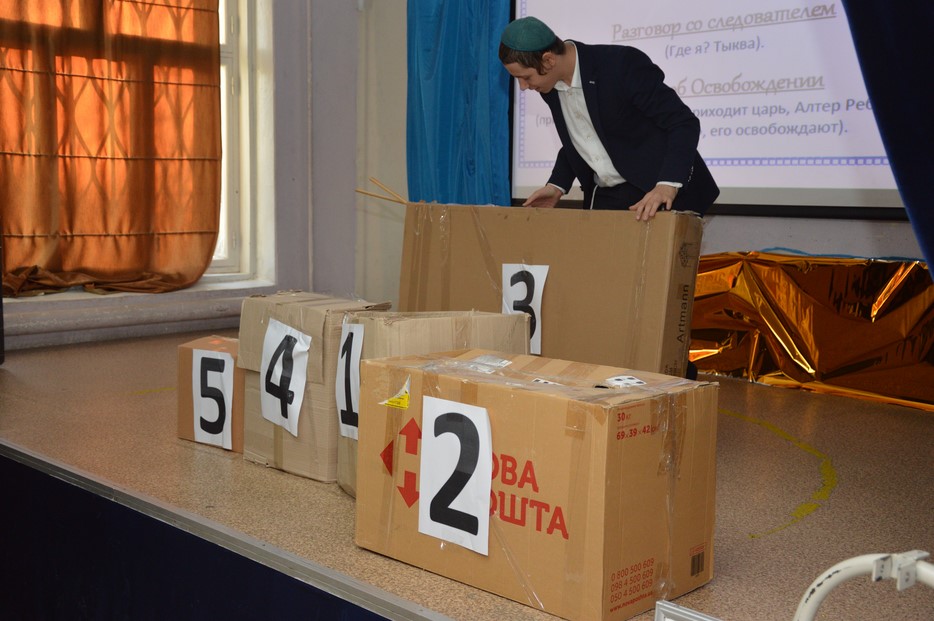 На 19 Кислева ученики иешивы, подготовили сценки, соответствующие истории «Дня Освобождения». Всего было 5 сценок, и предварительно названия всех были известны ученикам, но какую именно – заранее не было известно, и лишь когда среди преподавателей иешивы-ктана, которые были ответственными за 5 команд, начал разыгрываться реквизит к сценкам, то он и стал ключом и подсказкой, по которой они должны были догадаться, какую именно сценку им вместе с командой нужно показать!