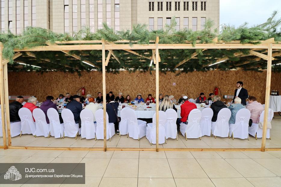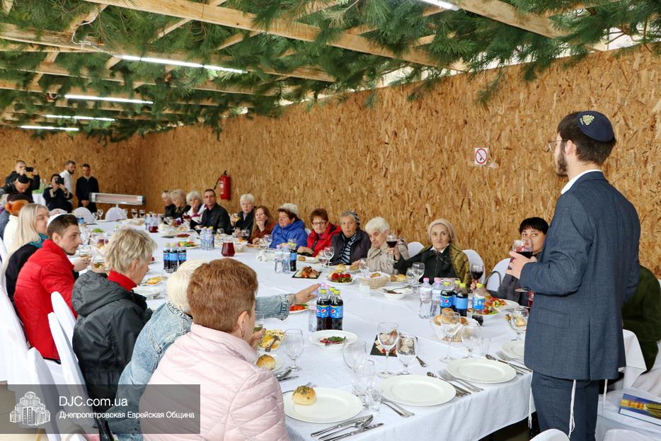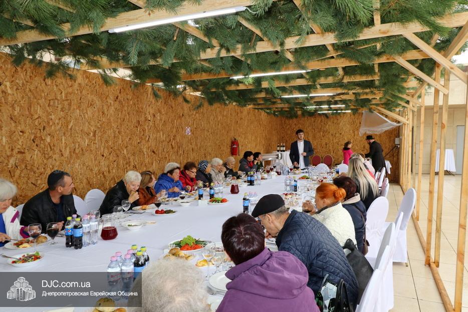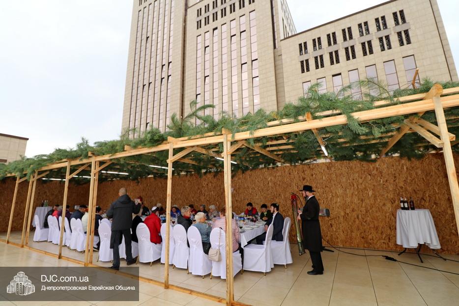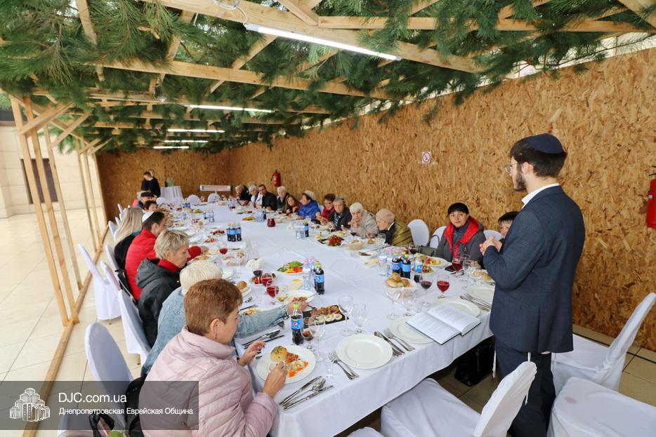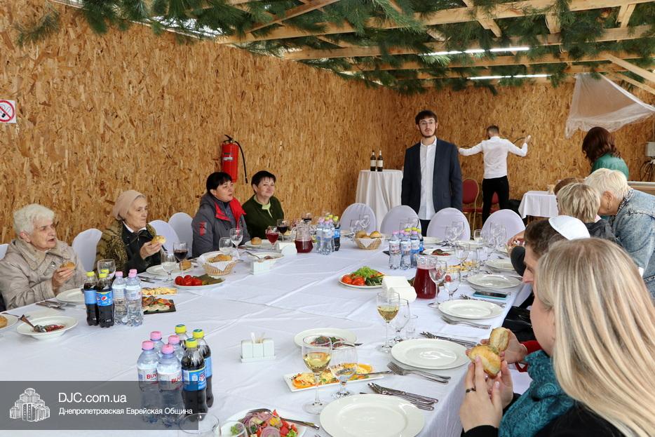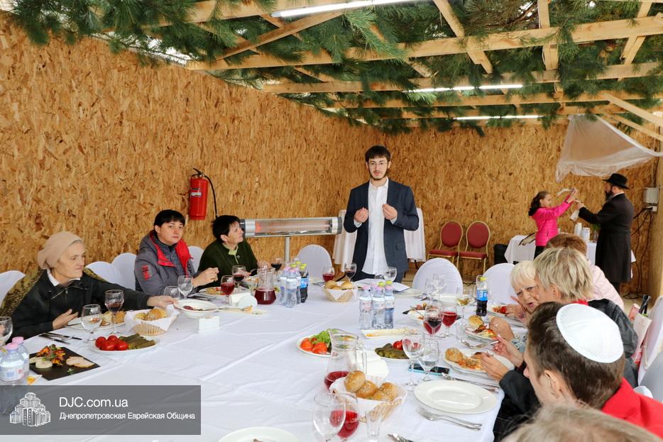 Встреча проходила на крыше главного зала торжеств Еврейской общины Днепра «Menorah Grand Palace» в главной сукке, где все смогли выполнить заповедь о «четырех растениях». Во время трапезы молодой раввин рассказал членам своей общины о празднике, значении и традициях Суккота.