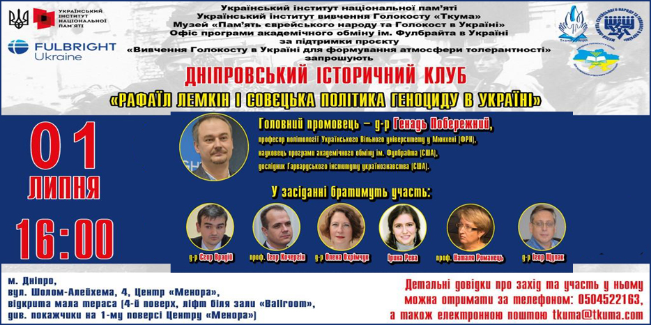 Напомним, что заседание «Днепровского исторического клуба» состоится 1 июля в 16:00 и его тема определена как: «Рафаїл Лемкін і совєцька політика геноциду в Україні».
