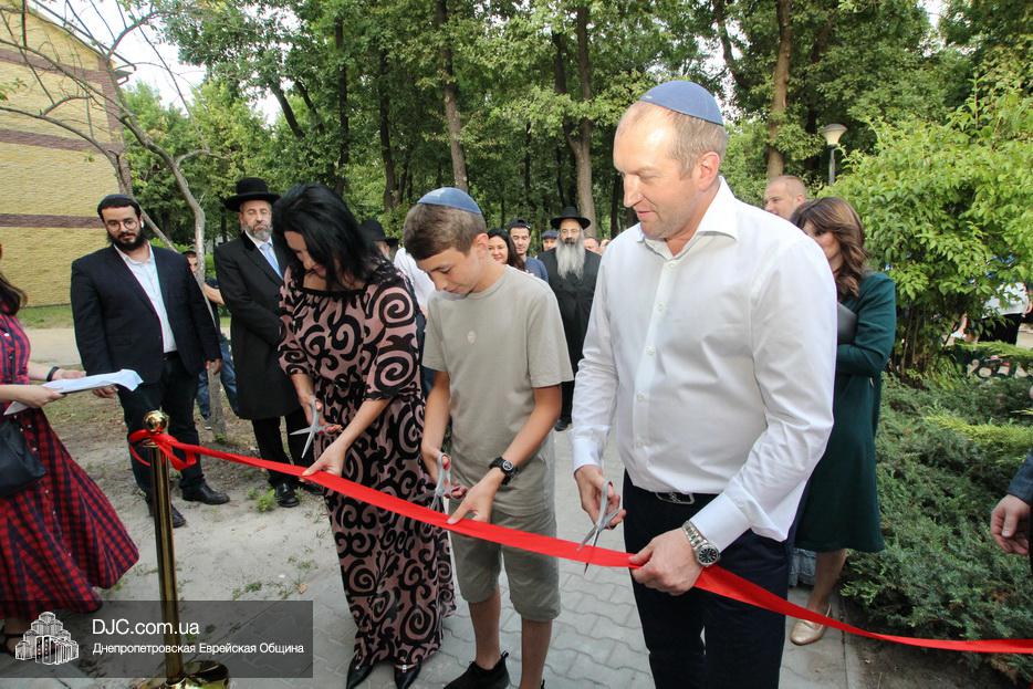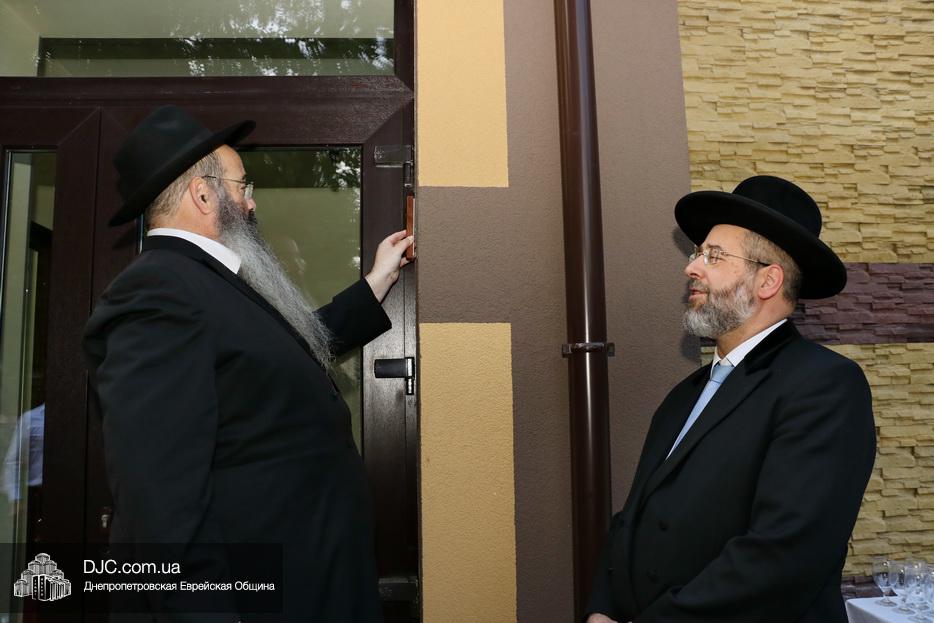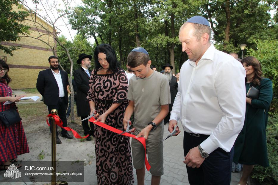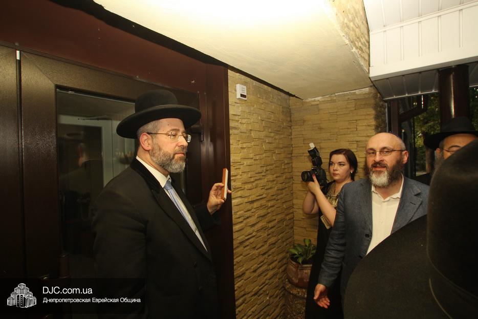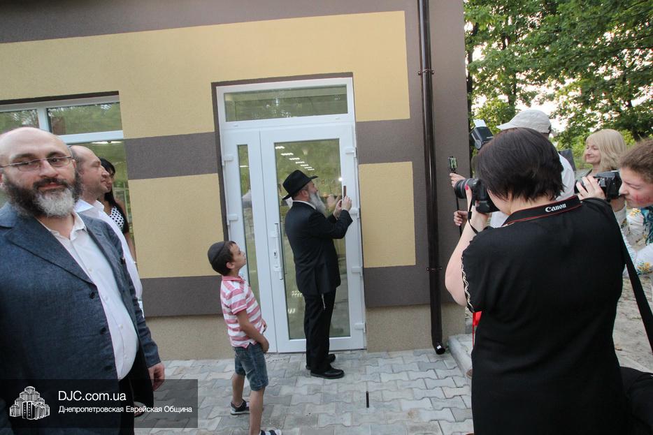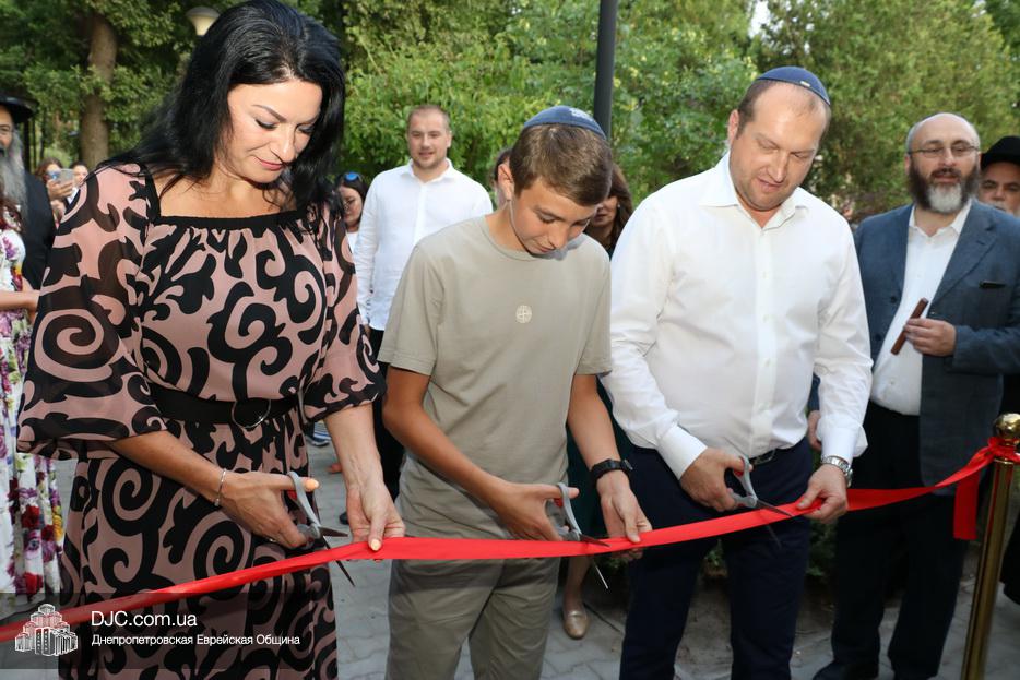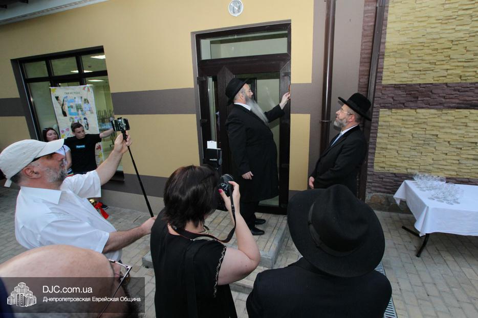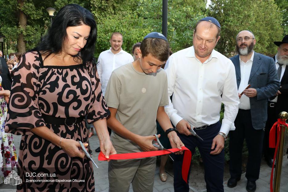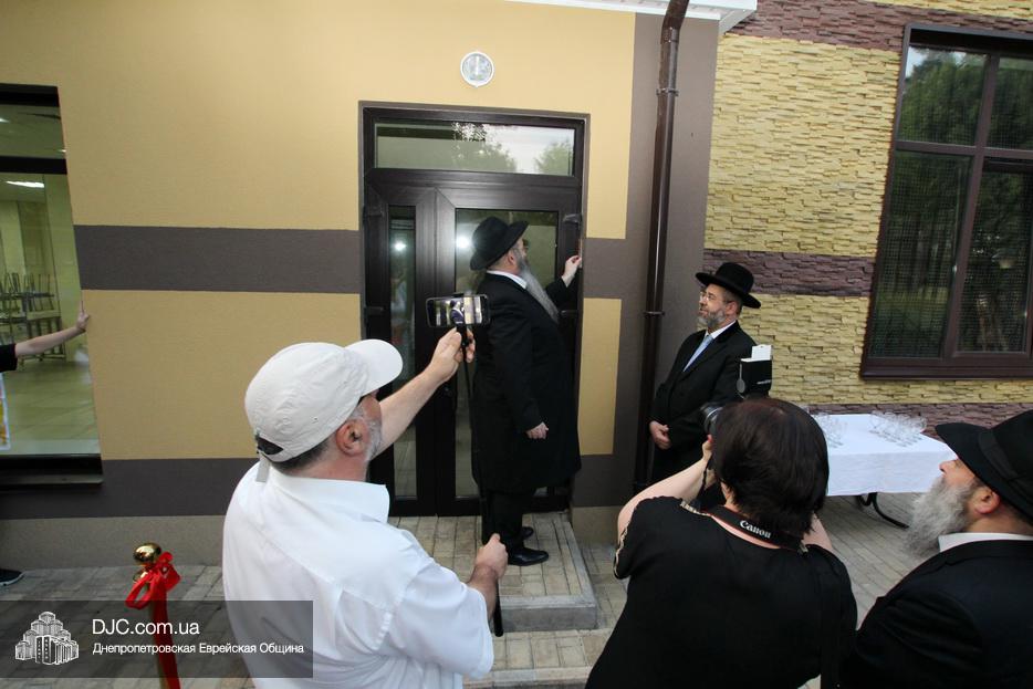Кульминацией чреды «Ханукат а-Байт» стала церемония открытия «Зала собраний» – красную ленточку перерезал меценат многих программ еврейской общины Днепра Виталий Абраменко с супругой Ириной и сыном Артуром. А мезузу ко входу в это здание прикрепил Главный раввин Днепра и региона Шмуэль Каминецкий.