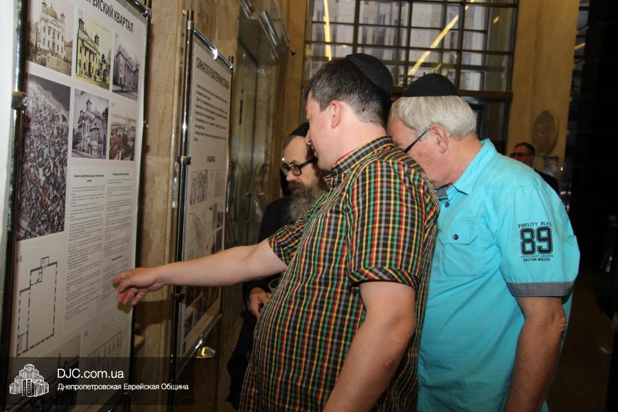На выставке была представлена лишь небольшая часть установленных объектов, где размещались екатеринославские синагоги, с точной привязкой к местности и изображениями зданий. Кроме того, один из стендов рассказывал о еврейских кладбищах. Особые разделы экспозиции были посвящены улицам, имеющим наибольшую плотность объектов еврейского материального наследия – Философской, Управской и той части центра города, которую исследователи определили как «большой еврейский квартал».