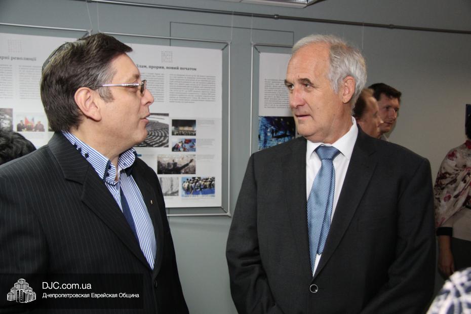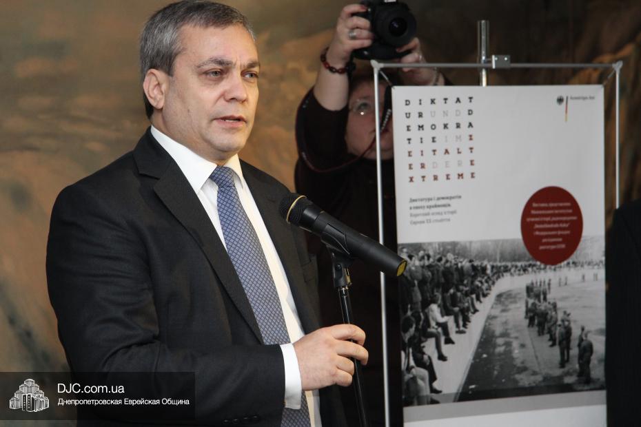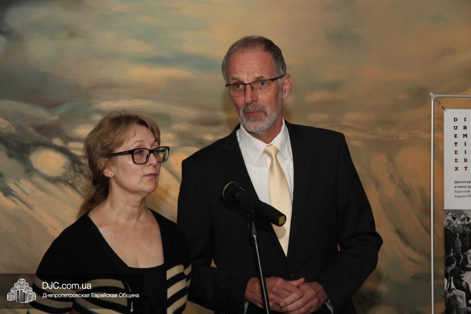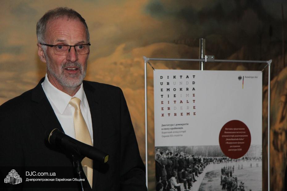 Далее перед собравшимися выступил Генеральный консул Федеративной Республики Германия в Украине, доктор Детлеф Вольтер. Он подчеркнул, что дата, к которой приурочено открытие немецкой выставки – знаковый и трагический день одновременно для всех, и также отметил, что «немецкому народу особенно важно не уходить от ответственности и помнить о том, что является правдой», соединяя память о прошлом – с настоящим. Кроме того, доктор Вольтер поблагодарил днепропетровскую общину и музей «Память еврейского народа и Холокост в Украине» за тесное, плодотворное сотрудничество. Говоря непосредственно о выставке, доктор Вольтер заметил, что с ее помощью «мы хотим показать, что нет ничего ценнее, чем человеческая жизнь, это камень для демократии. Но диктатура обесценивает человеческую жизнь, основы диктата – это страх и жертвы. Выставка отражает полную драматизма историю ХХ века, драму между свободой и тиранией, демократией и диктатурой».