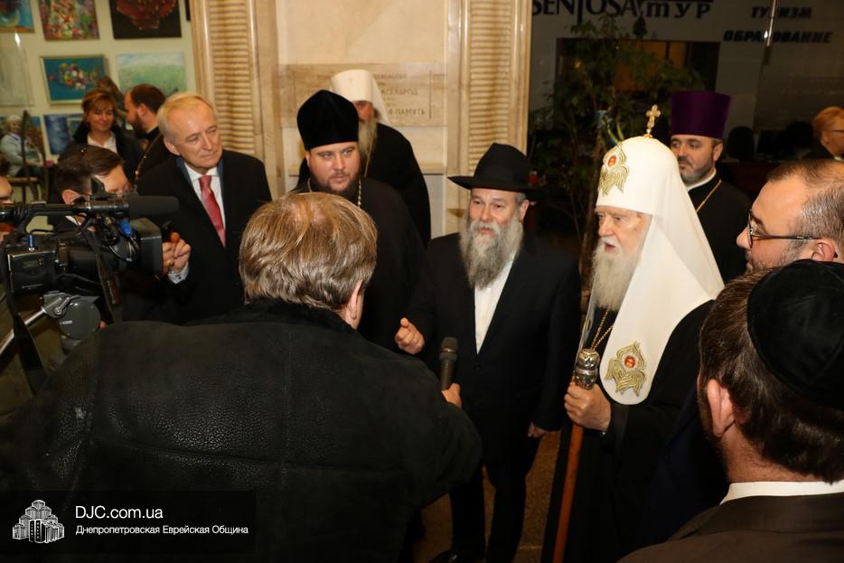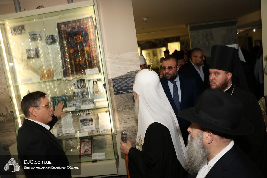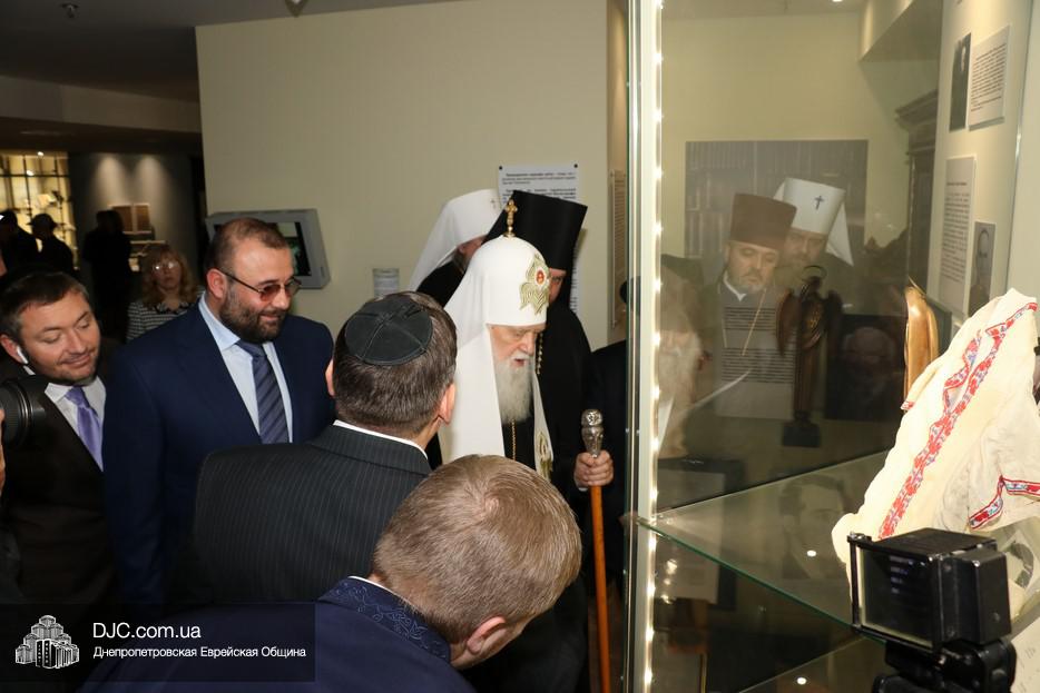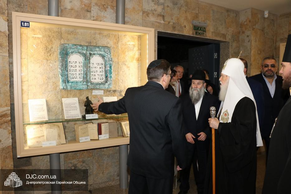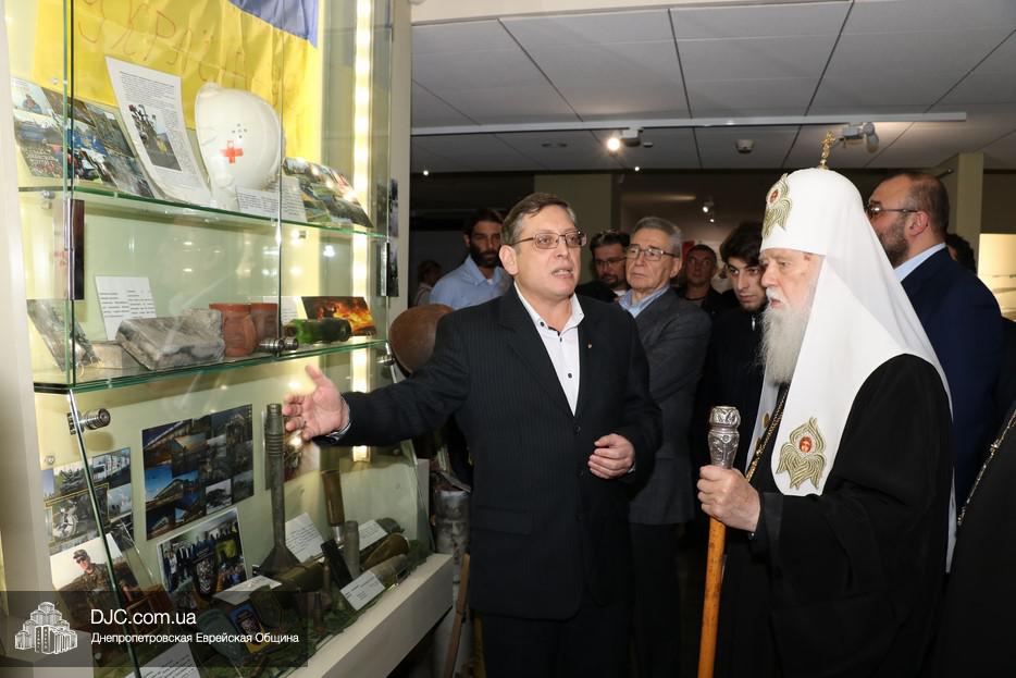 Осмотрев стенд, посвященный единству украинского народа разных этносов в защите украинской земли от российской агрессии на востоке Украины, патриарх заметил, что об этом надо рассказывать и взрослым, и детям, и что то, что делает Музей в Днепре – это чрезвычайно нужная работа и огромная заслуга перед Вс-вышним. Патриарх благословил всех православных сотрудников Музея, а Главный раввин Днепра и региона Шмуэль Каминецкий вручил высокому гостю памятный подарок – «Биркат а-Байт» с изображением «Меноры».
