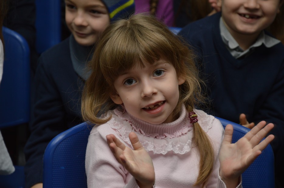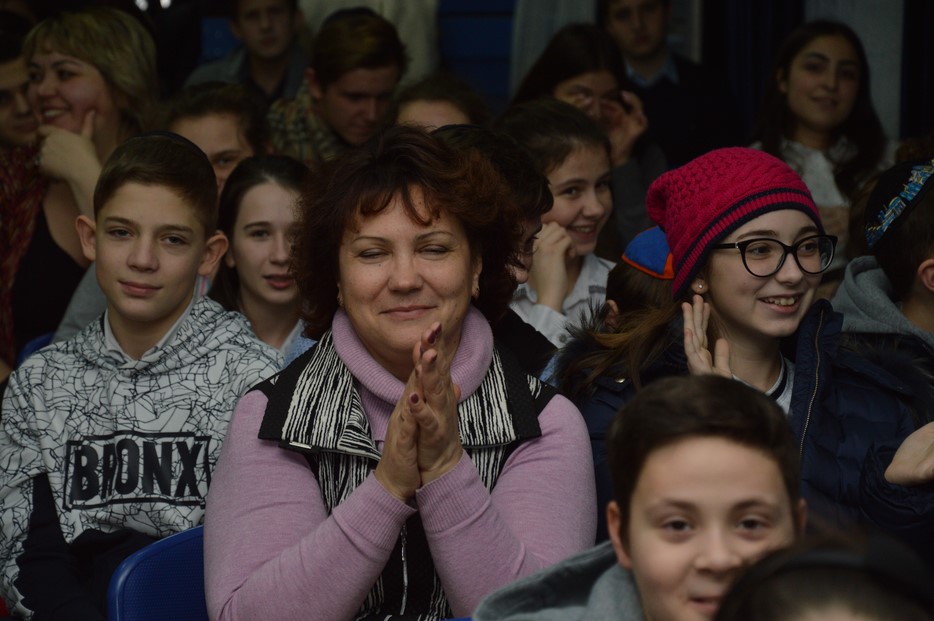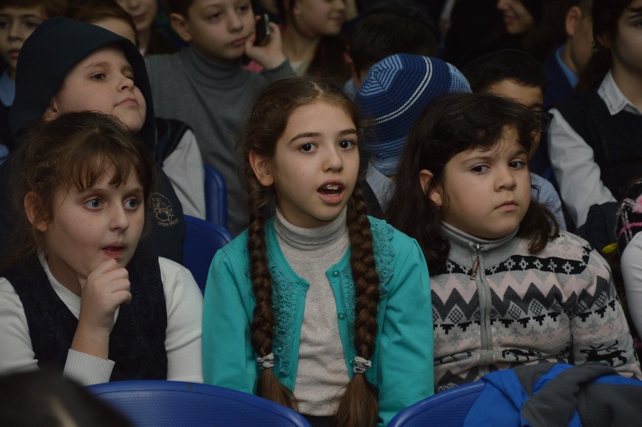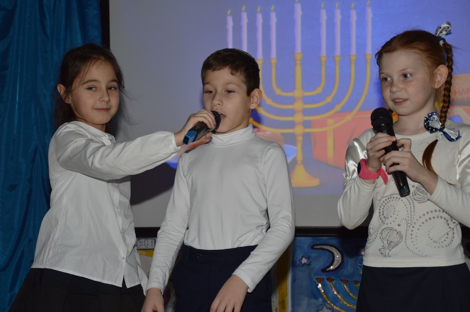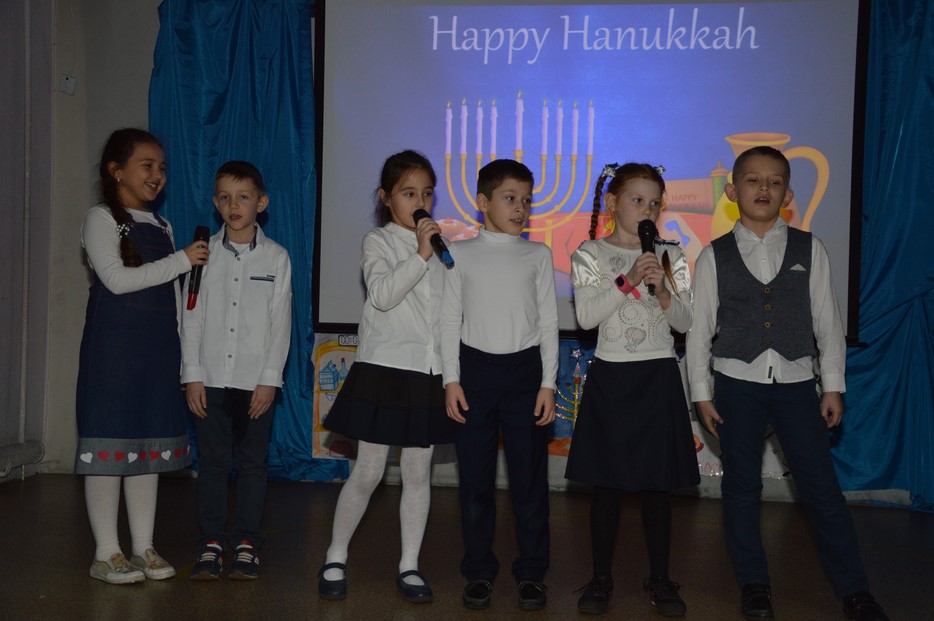 Сначала была концертная программа, подготовленная учениками 2-а класса, которые в своем музыкальном номере признались в своей любви к латкесам и пончикам. Затем был показан фрагмент видеообращения Любавического Ребе о важности праздника, а затем наступил кульминационный момент – церемония зажжения первой свечи.