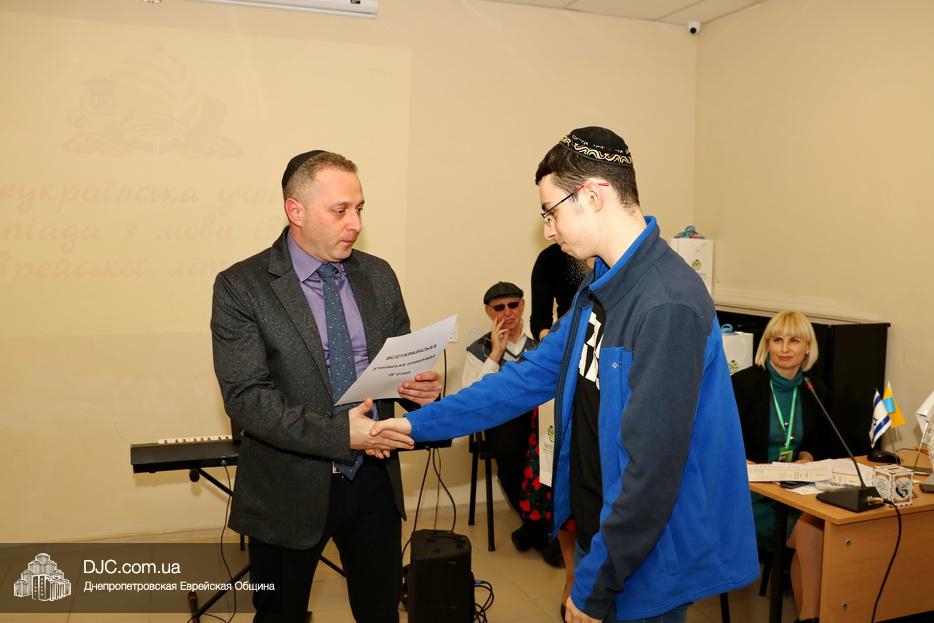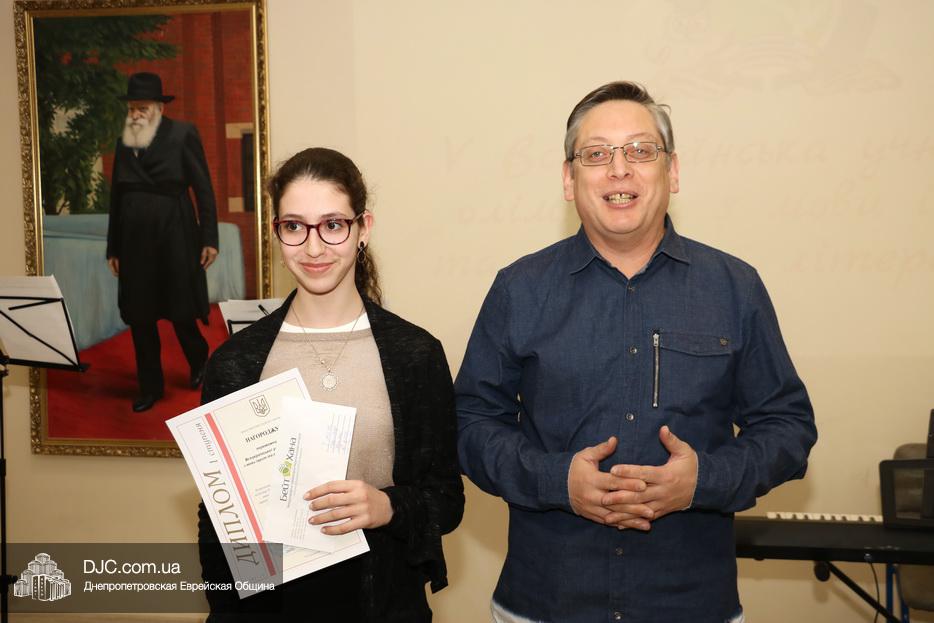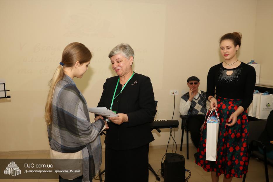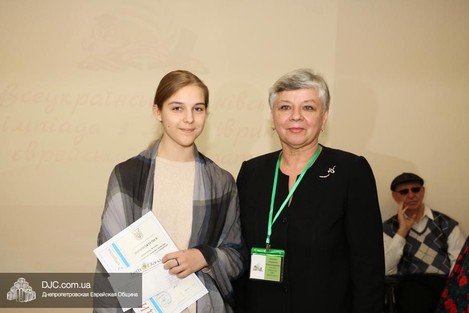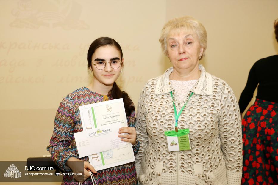 Об этом объявила, зачитывая официальное решение жюри, заведующая сектором государственного «Института модернизации содержания образования» пани Татьяна Гинетова. Высшую награду Олимпиады победительнице вручил директор Института «Ткума» и Еврейского Музея Днепра доктор Игорь Щупак.