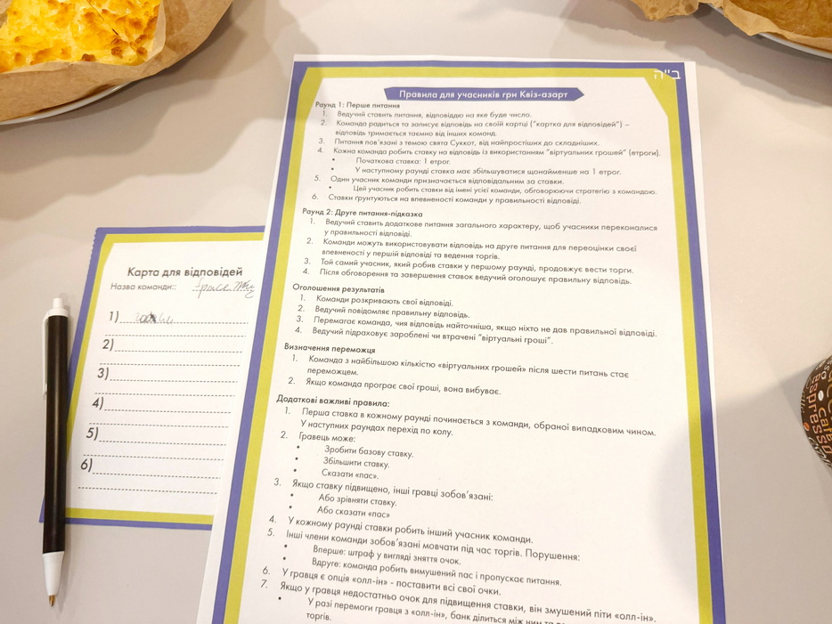 Организатор и ведущая программы Бейла Летичевская поделилась: «Мы решили начать занятие с веселой и необычной нотки – ребятам были представлены сгенерированные изображения евреев-супергероев, олицетворяющих четыре вида растений. После этого провели викторину «Квиз-азарт», где участники делали ставки и отвечали на вопросы о Суккоте. Несмотря на сложные вопросы, команда, которая решилась поставить все свои фишки в финальном раунде, эпично выиграла. Все ребята получили вкусные подарки в зависимости от своих достижений».