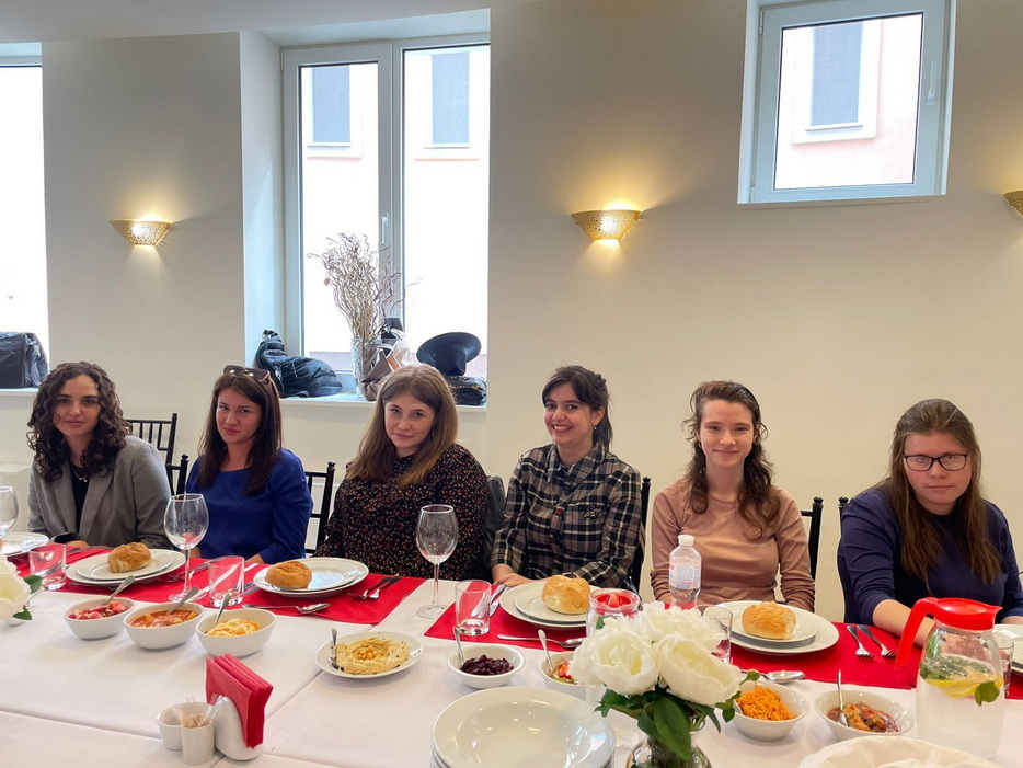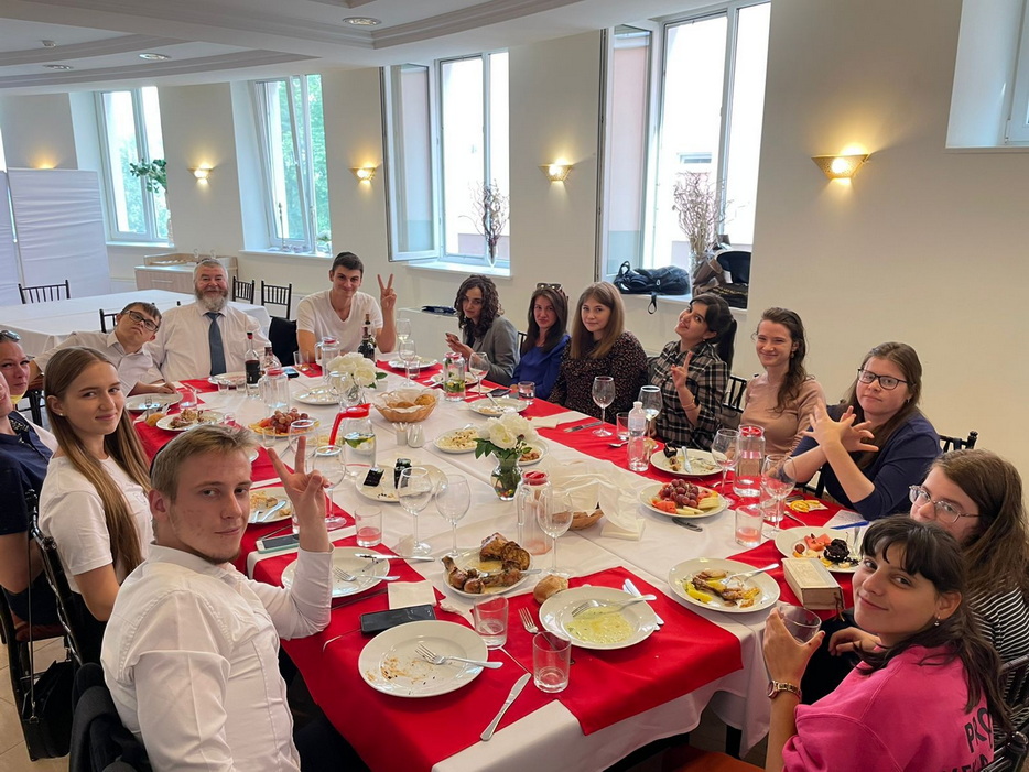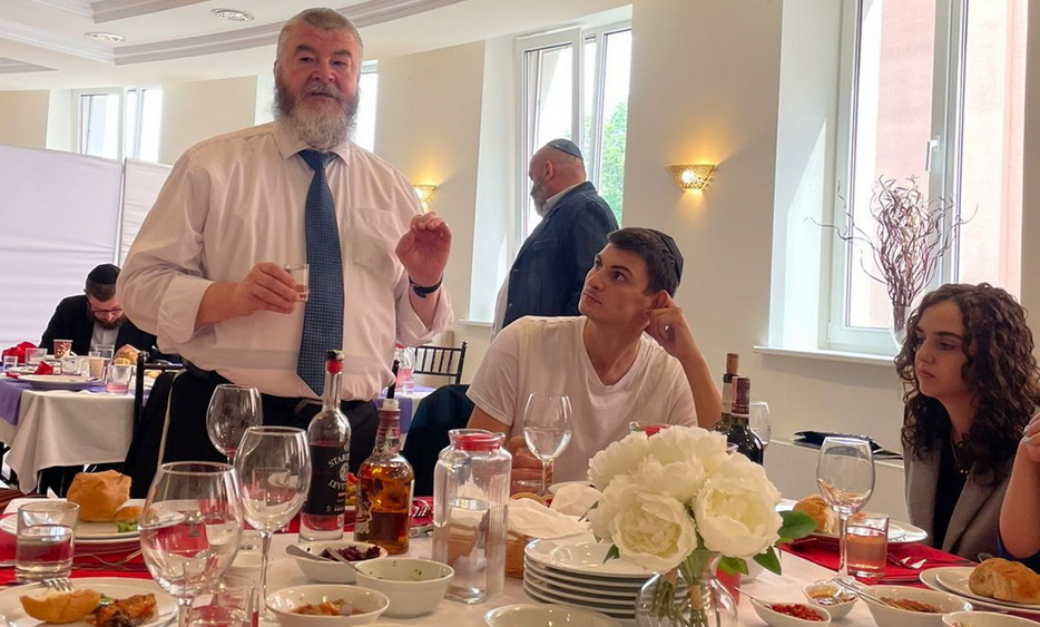 Затем участники мероприятия поднялись в зал трапез (согласно еврейским обычаям перед посещением могил праведников не принято есть). Здесь состоялся настоящий хасидский фарбренген с пением нигунов и рассказами о праведниках и чудесах.