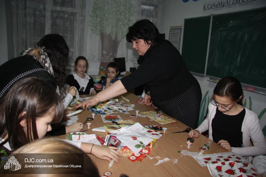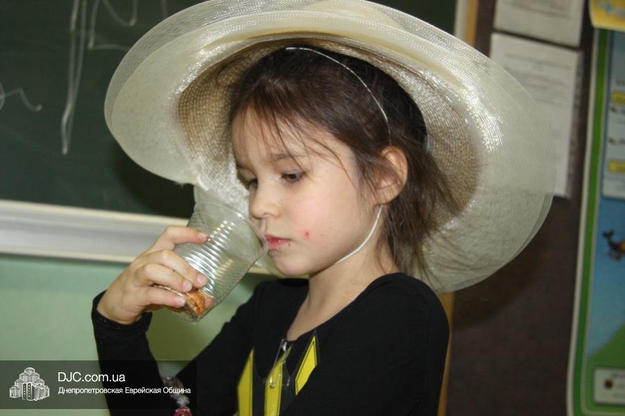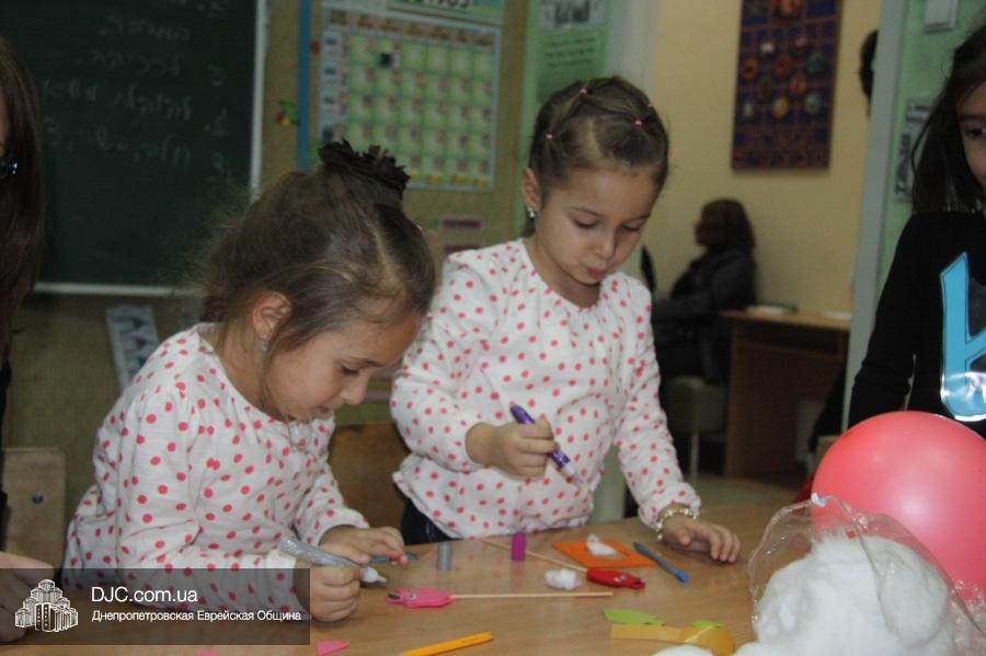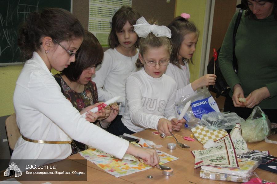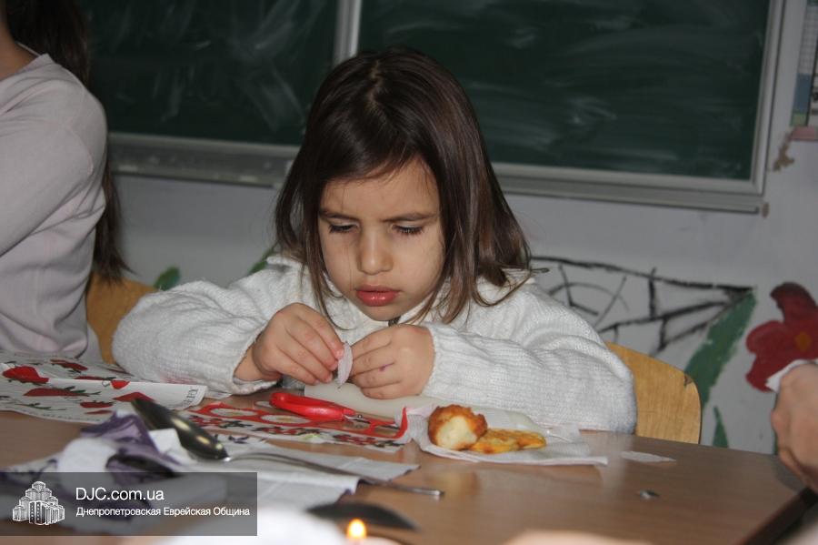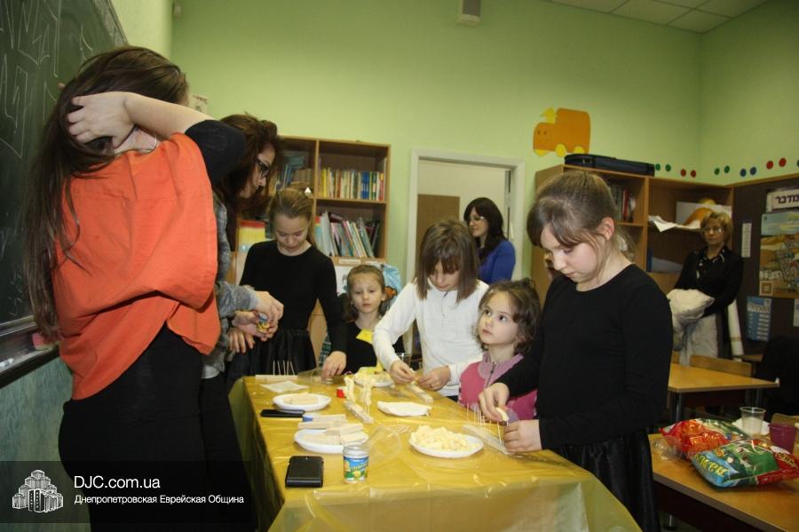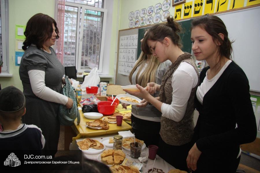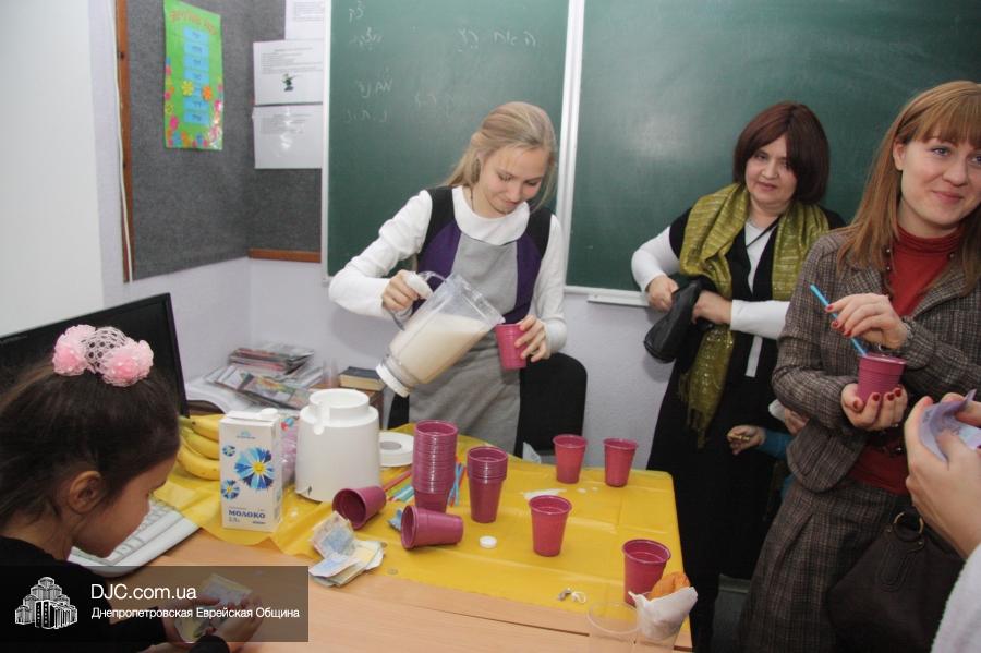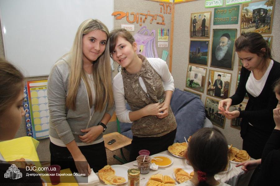 Во время ханукального марафона в классных комнатах расположились станции – на одной из них проводился мастер-класс по декорированию ханукальных свечей и созданию символической ханукии из сладостей, а на другой работал ресторанчик «В гостях у Пончика». В нем все желающие могли угоститься традиционными ханукальными блюдами, для приготовления которых используется масло: пончиками, оладьями и даже бельгийскими вафлями (как отдельно, так и с джемом или шоколадом), или просто выпить молока (которое, как известно, надо пить всем детям, чтобы видеть далеко и прыгать высоко).