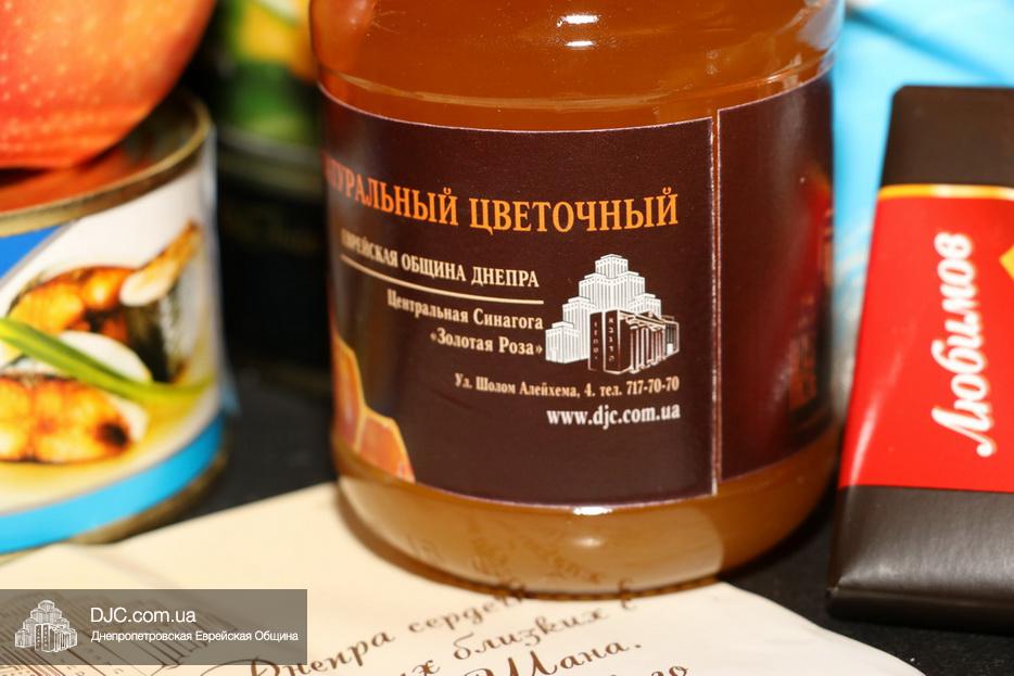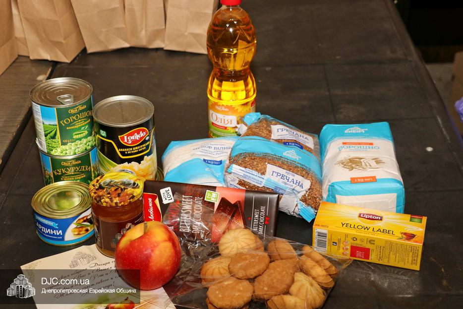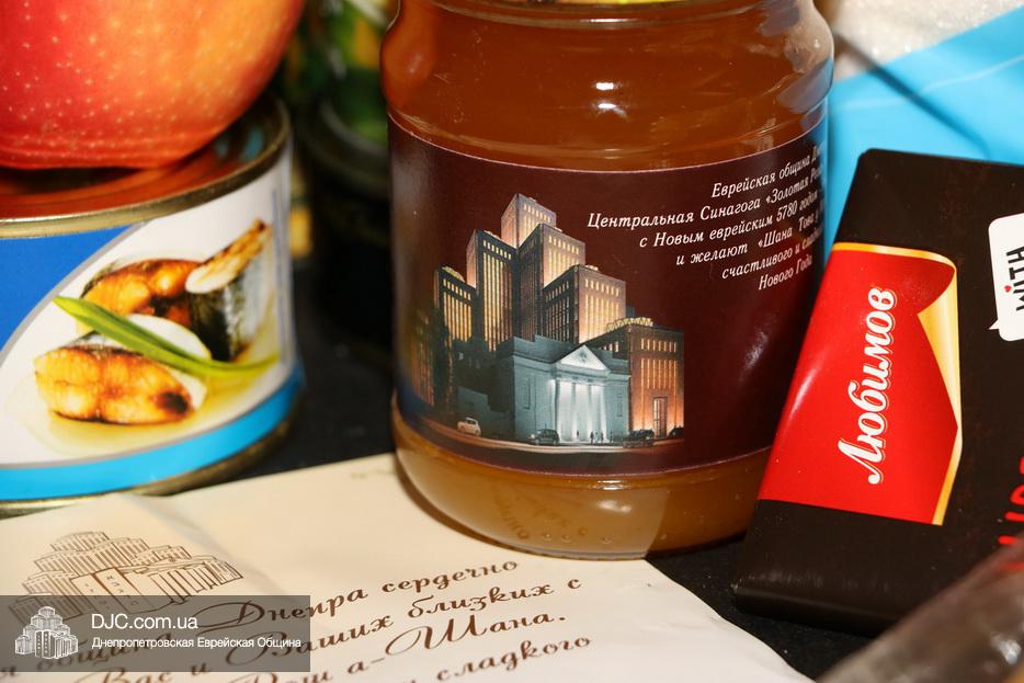 В состав продуктового набора входит, кроме традиционных яблок и меда – важных атрибутов праздника Рош А Шана, также продукты: мука, сахар, гречневая крупа, растительное мало, черный чай, консервы – сардины, шпроты, зеленый горошек, кукуруза и ананас, а также лакомства – черный шоколад, печенье. Кроме того, в каждый набор вложена открытка с поздравлением с наступающим Новым годом от имени Президента еврейской общины Геннадия Боголюбова и Главного раввина Шмуэля Каминецкого и расписанием важнейших событий месяца Тишрей на 5780 год.