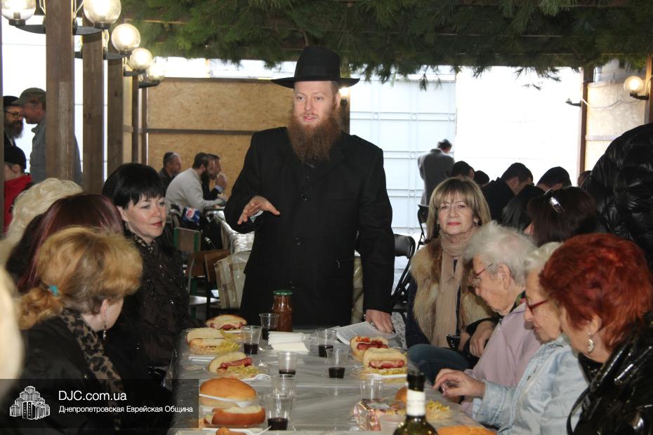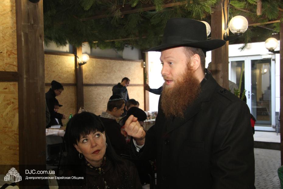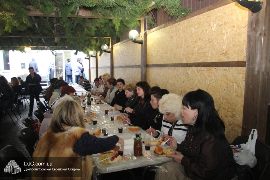 Всех женщин после исполнения «нетилат лулав» пригласили на праздничный кошерный обед от мясного кафе «Mendi’s». Для проведения традиционного урока руководительницы клуба пригласили Элишу Габриэля Павлоцкого, исполнительного директора Благотворительного Фонда «Шиурей Тора Любавич». Элиша Павлоцкий рассказал о значении для каждого еврея и всего еврейского народа праздника Суккот, пояснил, в чем заключен глубокий символизм заповеди «нетилат лулав» и что означает каждое из растений, необходимых для ее выполнения, ибо компоненты «арба миним» – этрог, лулав, адас и арава – символизируют четыре категории евреев – тех, кто знает Тору и выполняет ее заповеди; тех, кто обладает скромными познаниями в Торе, но прилежно исполняет ее законы; тех, кто силен в знаниях Святой Книги, но не следует, как положено, заповедям; и, наконец, тех сынов еврейского народа, которые пока не пришли ни к Торе, ни к еврейскому традиционному образу жизни. Также гость праздничного заседания объяснил, почему для покрытия шатров используется природный материал, который не способен защитить от дождя и холода и кратко рассказал о традициях грядущих праздников Шмини Ацерет и Симхат Тора, а именно, об Акафот – танцах с Торой.