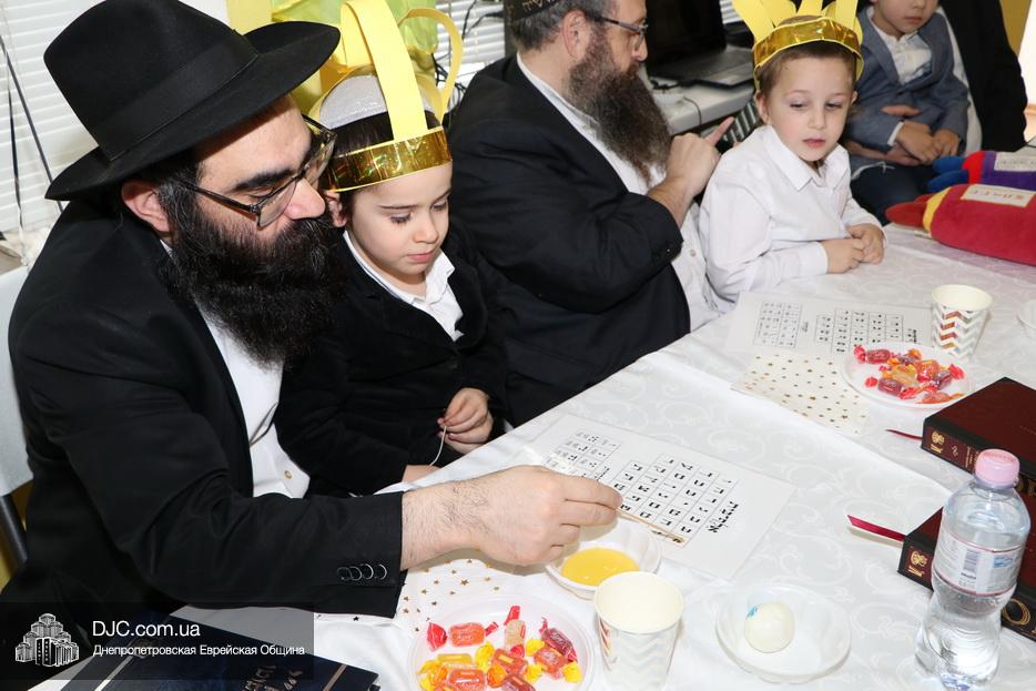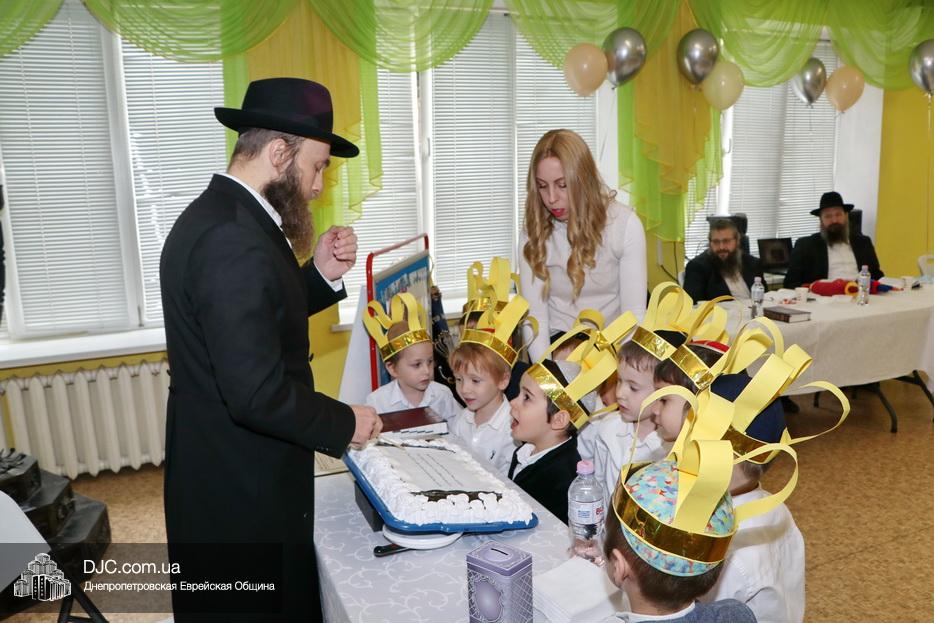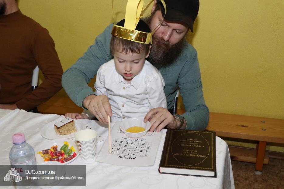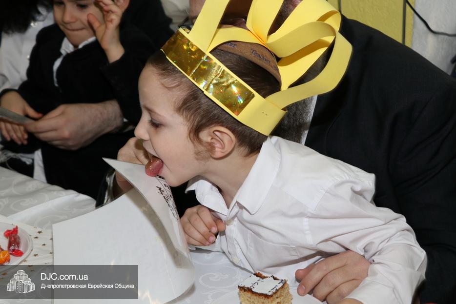 Затем меламед Реувен Гринберг показал детям буквы, которые они будут изучать, а они хором за ним повторяли их. После чего каждый ребенок почувствовал сладость изучения Торы – на листок с алфавитом было капнуто медом и каждому мальчику разрешили его облизнуть. Также по традиции особая надпись была нанесена и на сваренные в крутую куриные яйца, и на специальный торт, и каждый ребенок символически воспринял еврейские знания с помощью всех органов чувств.