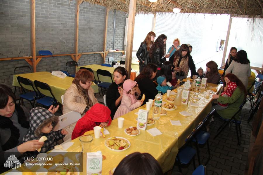 Затем, когда все приглашенные дети и родители собрались, гости были приглашены в Сукку за общий стол, чтобы вместе, как и положено, выполнить важнейшие заповеди пребывания в шалаше: есть, пить и радоваться празднику Суккот. Двора Фурлендер рассказала родителям, что символизирует каждое из четырех растений, необходимых для выполнения заповеди «нетилат лулав», а Рахель Виноградова объяснила, почему в дни Суккот евреи должны проводить время и совершать все трапезы в шалашах.