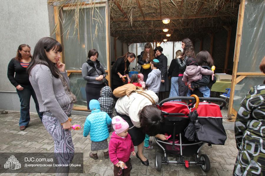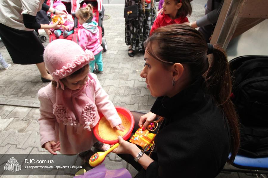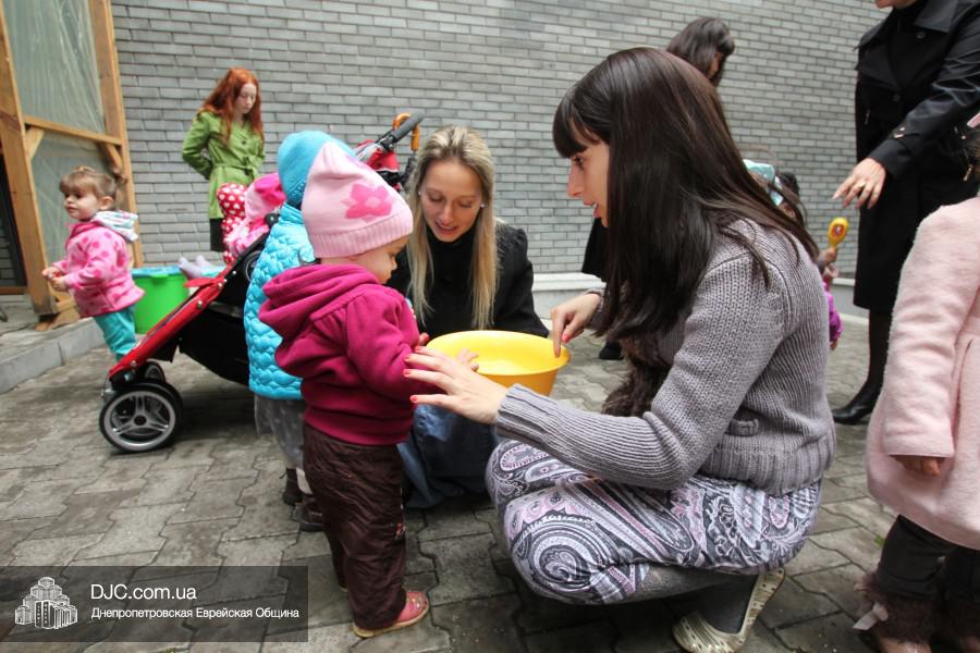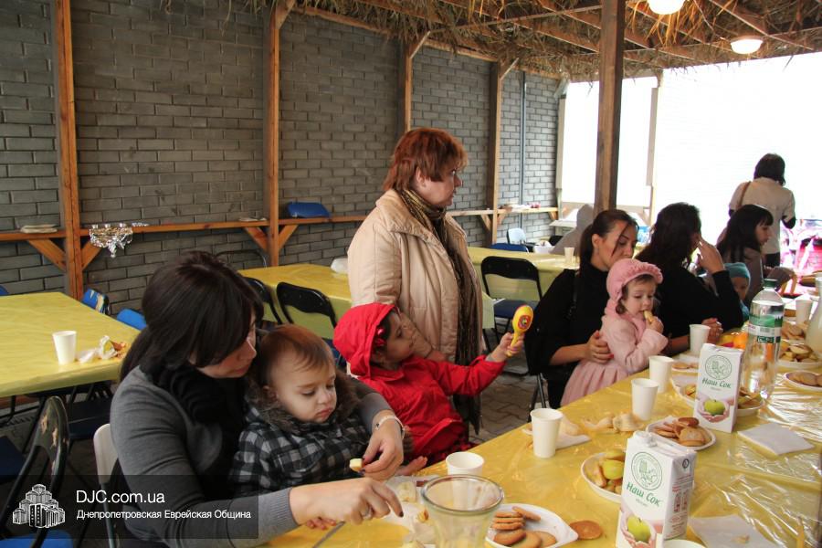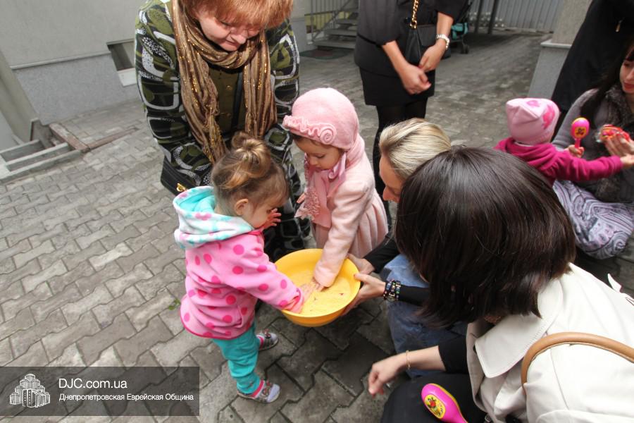Гостей праздника – малышей, их старших братиков, сестричек и родителей – в шалаше встречали воспитатели «Иланы» и администрация яселек – директор Алла Шурпинова и руководитель программ еврейского компонента Двора Фурлендер. Под руководством воспитателя старшей группы «Иланы» Рахель Виноградовой, родители смогли исполнить заповедь «нетилат лулав», которую надлежит выполнять в дни праздника Суккот, а малыши в это время общались друг с другом и играли розданными им погремушками, тряся которыми дети готовятся к исполнению заповеди о «четырех растениях».