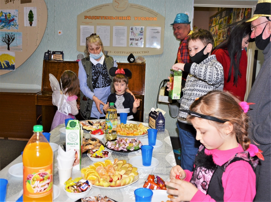 После спектакля на тему Пурима маленьким зрителям вручили мишлоах манот – сладкие подарки от Федерации еврейских общин Украины. Внимание к нашим воспитанникам стало доброй традицией ФЕОУ, которая не прерывается уже много лет. Мы также благодарим руководство Федерации за гостинцы для пуримского фуршета: особые сдобные пирожки с маком (гоменташи) и конфеты. Сладкая трапеза для детей стала обязательной частью каждого праздника, и это предмет особой заботы Благотворительного фонда «Маале».