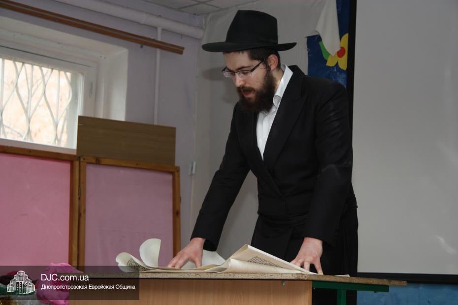 В этом году пуримский праздник в еврейской школе проходил в несколько этапов. Сначала ребята младших классов и их учителя были приглашены исполнить важнейшую праздничную заповедь – послушать чтение Свитка Эстер, который читал машпия «Иешивы-ктана Любавич Украина для детей раввинов и посланников» раввин Элиягу Хейфер. В это время старшеклассники, ребята 5-9 классов, готовились к предстоящему карнавалу и дарили друг другу праздничные сладости, мишлоах манот. Затем малыши отправились по своим классным кабинетам, где они заканчивали подготовку к своему праздничному костюмированному выходу, а ученики старших классов были приглашены послушать чтение Мегилат Эстер, вновь в исполнении раввина Хейфера.
